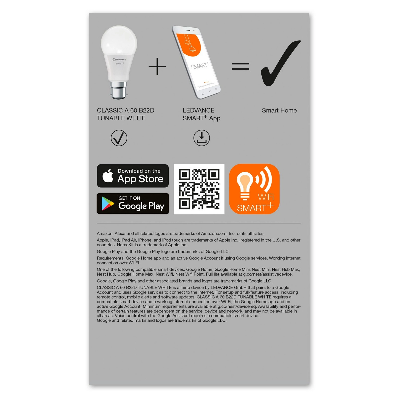 Klasyczny kształt żarówki z technologią WiFi. Cechy produktu: Sterowanie za pomocą aplikacji LEDVANCE SMART+ (z systemem Android™️ co najmniej 8.0 lub iOS 14.0). Możliwość sterowania przez Asystenta Google i Amazon Alexa. Protokół sieciowy: WiFi. Regulacja temperatury barwowej światła: 2700…6500 K. Ściemnialne. Trwałość: do 15 000 h. Korzyści ze stosowania produktu: Sterowanie bezprzewodowe za pomocą aplikacji. Łatwy montaż i użycie. Nie zawiera rtęci. Obszar zastosowań: Oświetlenie ogólne. Pomieszczenia mieszkalne. Zastosowania profesjonalne (hotele, bary, butiki itp.). Zastosowania zewnętrzne - tylko w odpowiednich oprawach. Wyposażenie / Akcesoria: Do sterowania za pomocą aplikacji LEDVANCE SMART+ wymagany jest smartfon lub tablet (z systemem Android co najmniej 8.0 lub iOS 14.0).