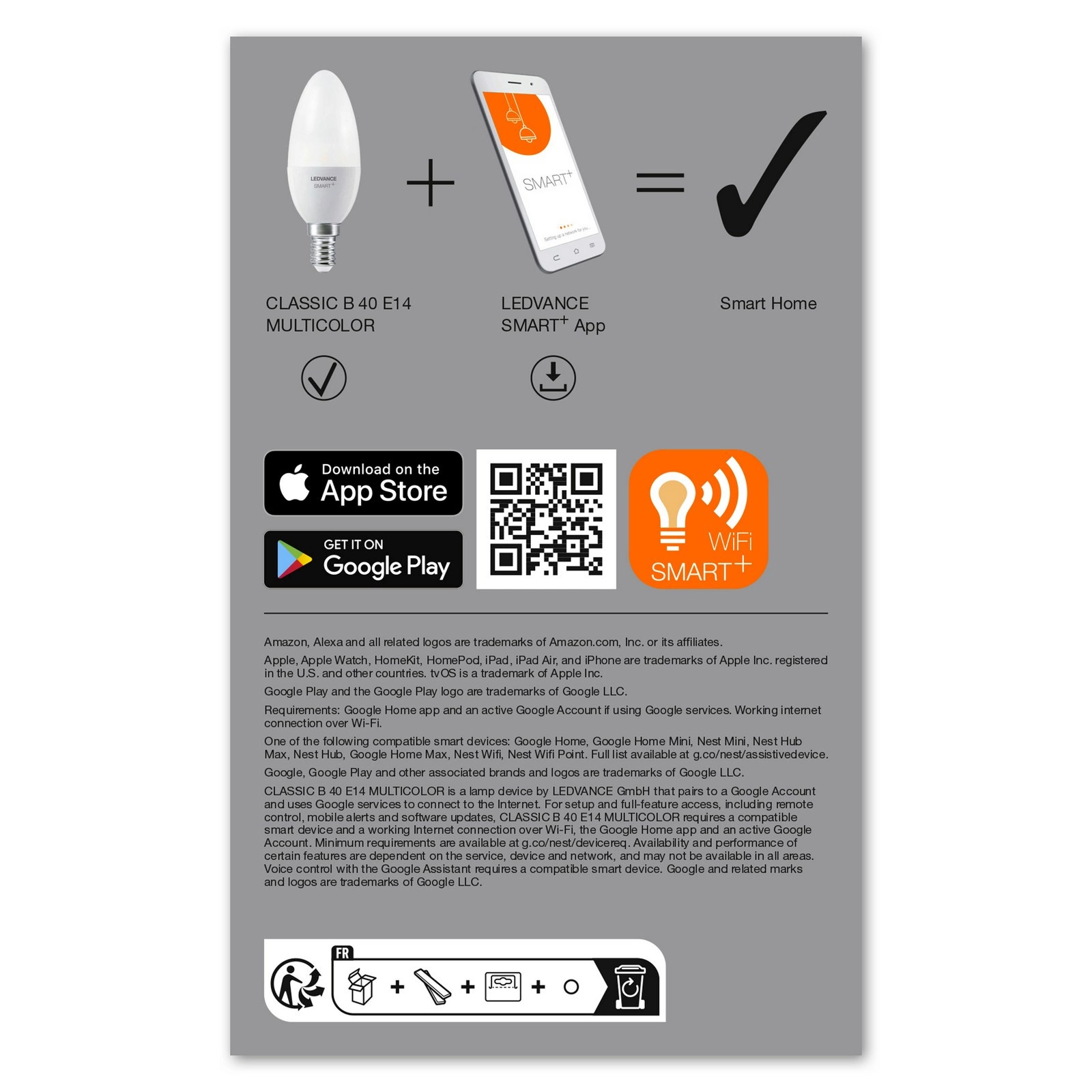 Klasyczny kształt żarówki świecowej z technologią WiFi. Cechy produktu: Możliwość sterowania za pomocą aplikacji LEDVANCE SMART+ (z systemem Android co najmniej 8.0 lub iOS 14.0). Regulacja temperatury barwowej światła: 2700…6500 K. Sterowanie kolorami RGB. Ściemnialne. Protokół sieciowy: WiFi. Trwałość: do 20 000 h. Sterowanie głosowe działa z Hej Google lub Alexa. Korzyści ze stosowania produktu: Sterowanie bezprzewodowe za pomocą aplikacji. Łatwy montaż i użycie. Nie zawiera rtęci. Obszar zastosowań: Oświetlenie ogólne. Pomieszczenia mieszkalne. Zastosowania profesjonalne (hotele, bary, butiki itp.). Do użytku na zewnątrz tylko w odpowiednich oprawach zewnętrznych. Wyposażenie / Akcesoria: Do sterowania za pomocą aplikacji LEDVANCE SMART+ wymagany jest smartfon lub tablet (z systemem Android co najmniej 8.0 lub iOS 14.0).