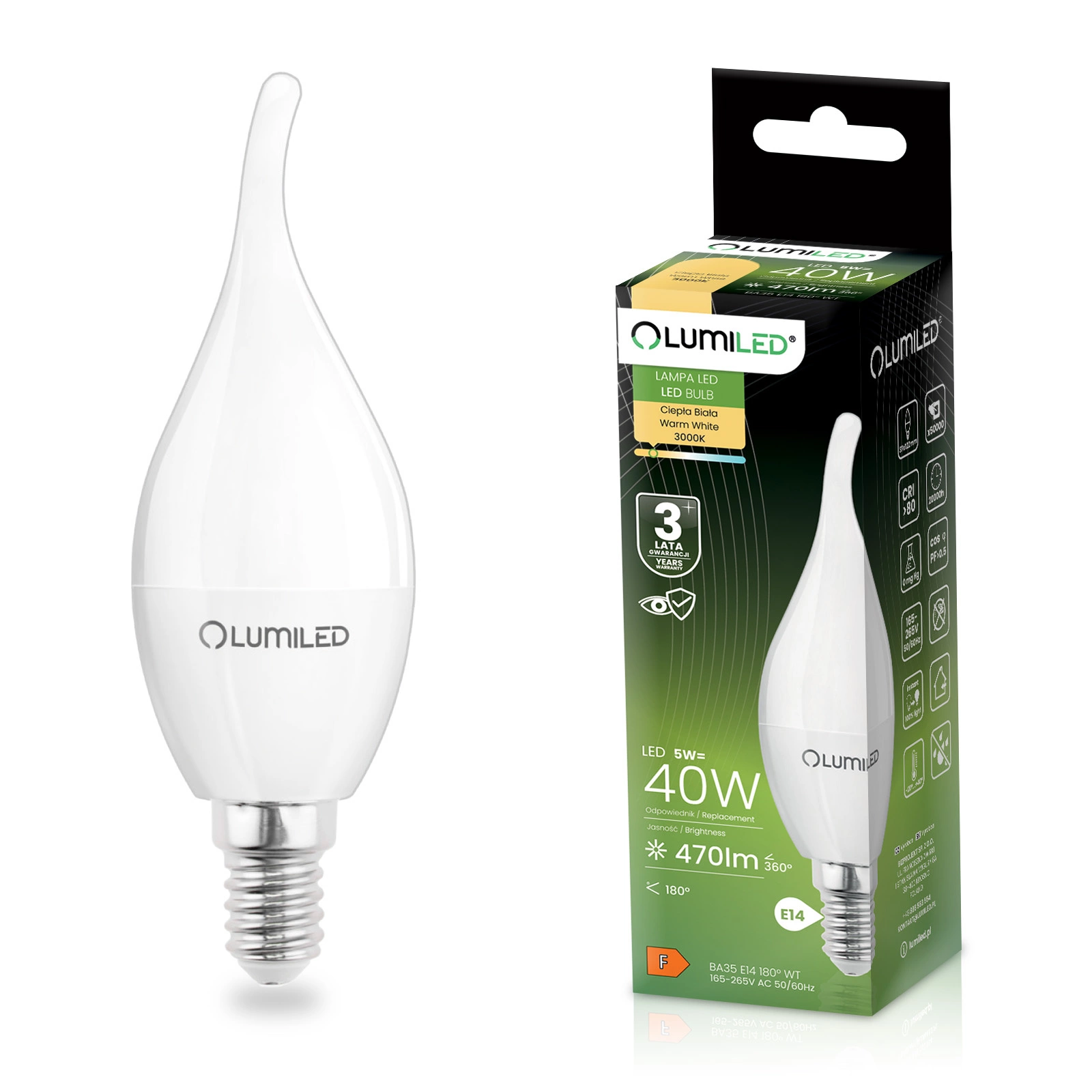 Żarówka LED E14 Świeczka BA35 5W = 40W 470lm 3000K Ciepła 180° LUMILED