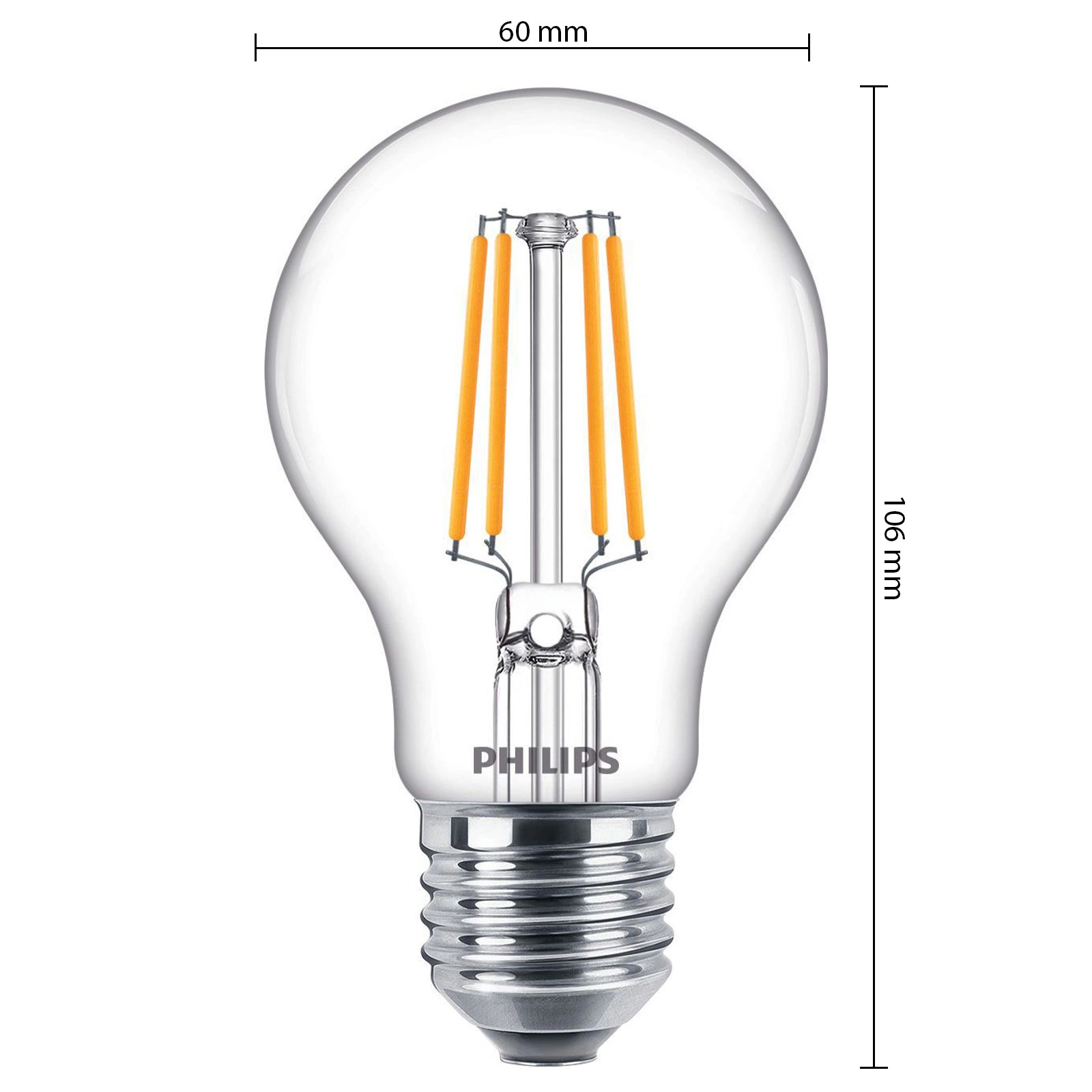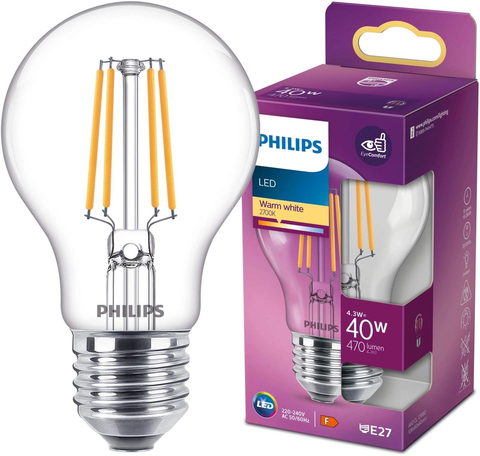 Odkryj nowy wymiar oświetlenia dzięki żarówce LED E27 A60 4.3W od Philips. Ta innowacyjna żarówka o klasycznym kształcie A60 została zaprojektowana, aby połączyć stylowy wygląd z doskonałą wydajnością. Dzięki zastosowaniu technologii FILAMENT LED, osiąga strumień świetlny o wartości 470 lm, oferując jednocześnie przytulne, ciepłe światło o temperaturze barwowej 2700K. To idealny zamiennik tradycyjnej żarówki 40W, który zużywa jedynie 4.3W energii, co pozwala na oszczędność na rachunkach za prąd.