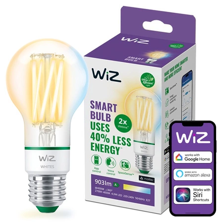 Żarówka LED E27 A60 4.3W = 60W 903lm 2700-4000K TW FILAMENT Inteligentna SMART WiFi Bluetooth Aplikacja WiZ