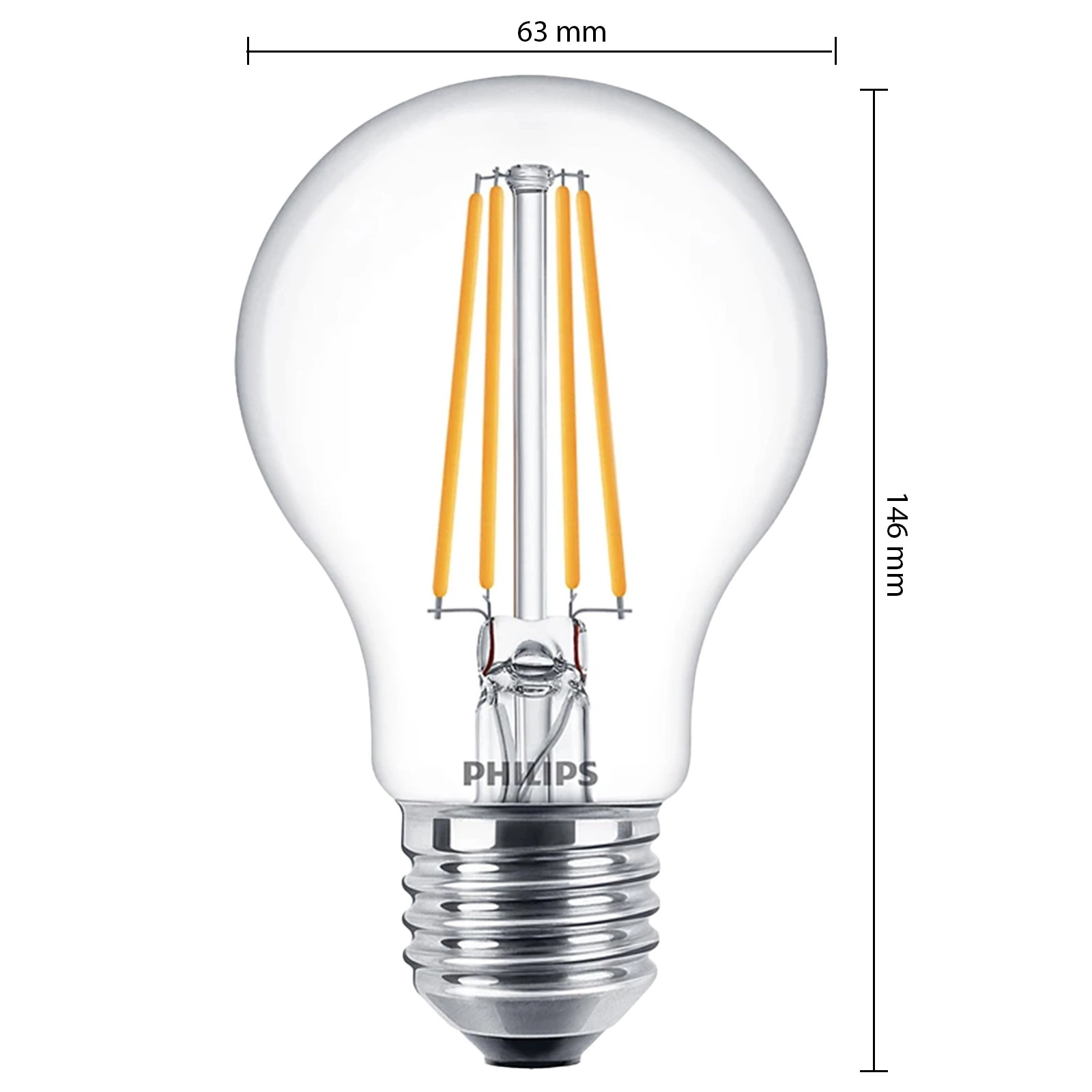 Żarówka LED marki PHILIPS 7W, do używania na co dzień w pomieszczeniach. Znajome kształty, które kochasz. Zużywają około 85% mniej energii niż tradycyjne żarówki dzięki najnowszej technologii energooszczędnej LED i mają dziesięć razy dłuższy okres użytkowania. Żarówka filamentowa standardowa z przezroczystego szkła, z gwintem E27, 15 000 godzin eksploatacji i strumień światła o wartości 806 lumenów. Moc lampy odpowiada światłu żarówki 60W.