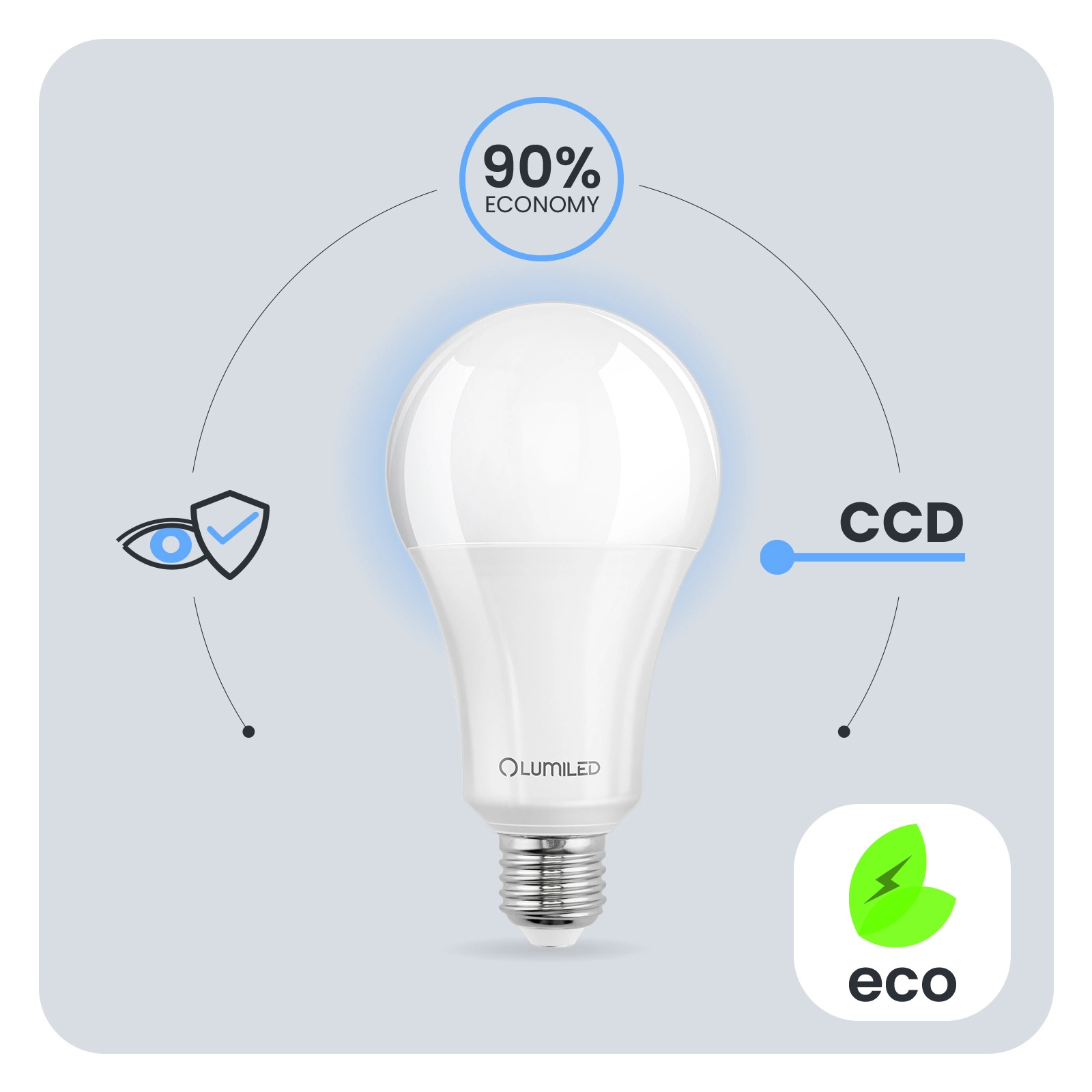 Zastosowana przetwornica CCD w żarówce LED sprawia, że żarówka jest odporna na spadki i wzrosty napięcia w sieci. Światło nie migocze, ani nie drży. Przetwornica CCD sprawia, że żarówka jest bezawaryjna przez długi czas. Żarówki LUMILED zaprojektowane zostały z myślą o jej użytkownikach. Słaba jakość oświetlenia może prowadzić do zmęczenia oczu dlatego nasze Żarówki posiadają opracowanie techniczne Eye Safe zapewnią komfortowe i przyjazne oświetlenie twoim oczom w każdym pomieszczeniu.