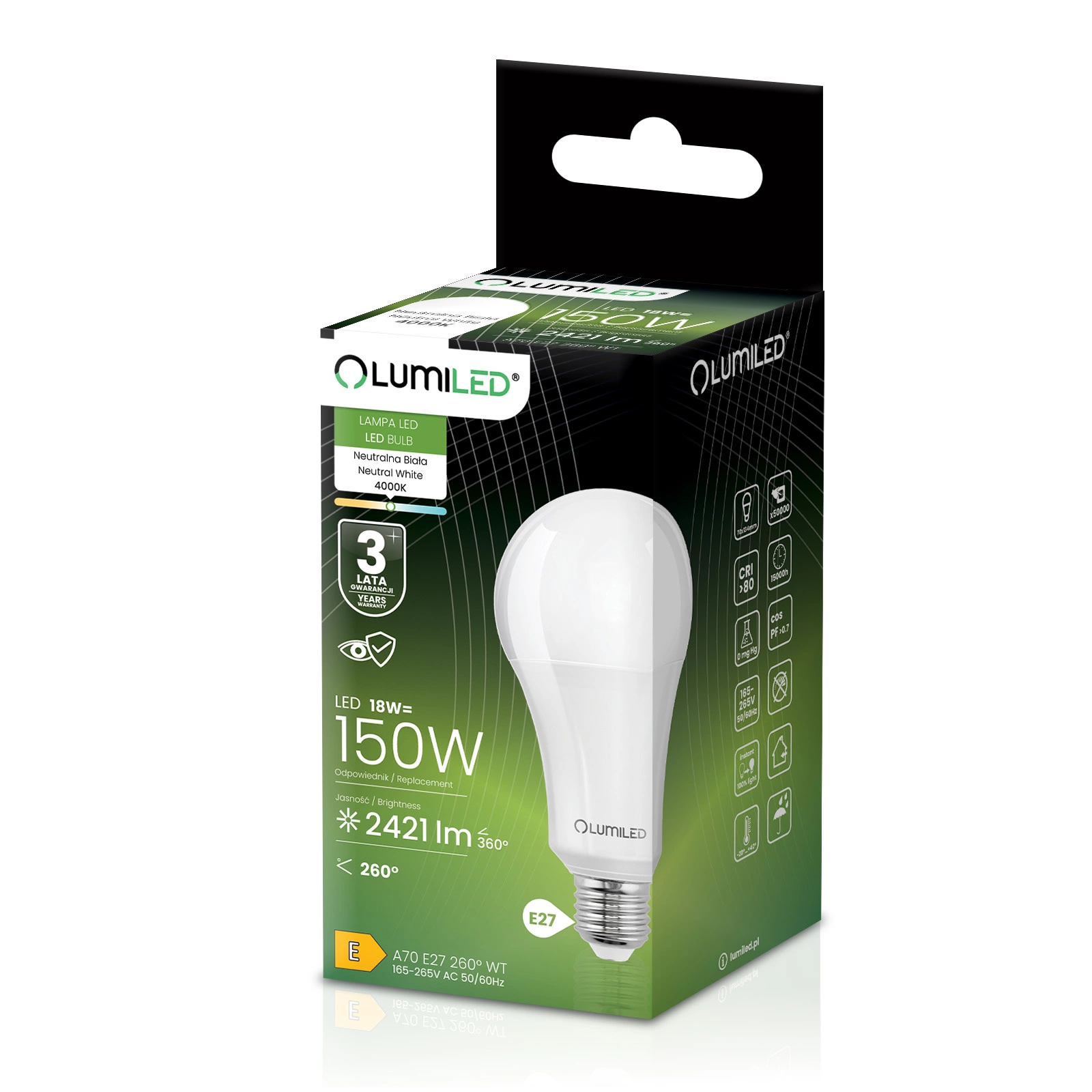 Żarówka LED E27 A70 18W = 150W 2421lm 4000K Neutralna 260° LUMILED