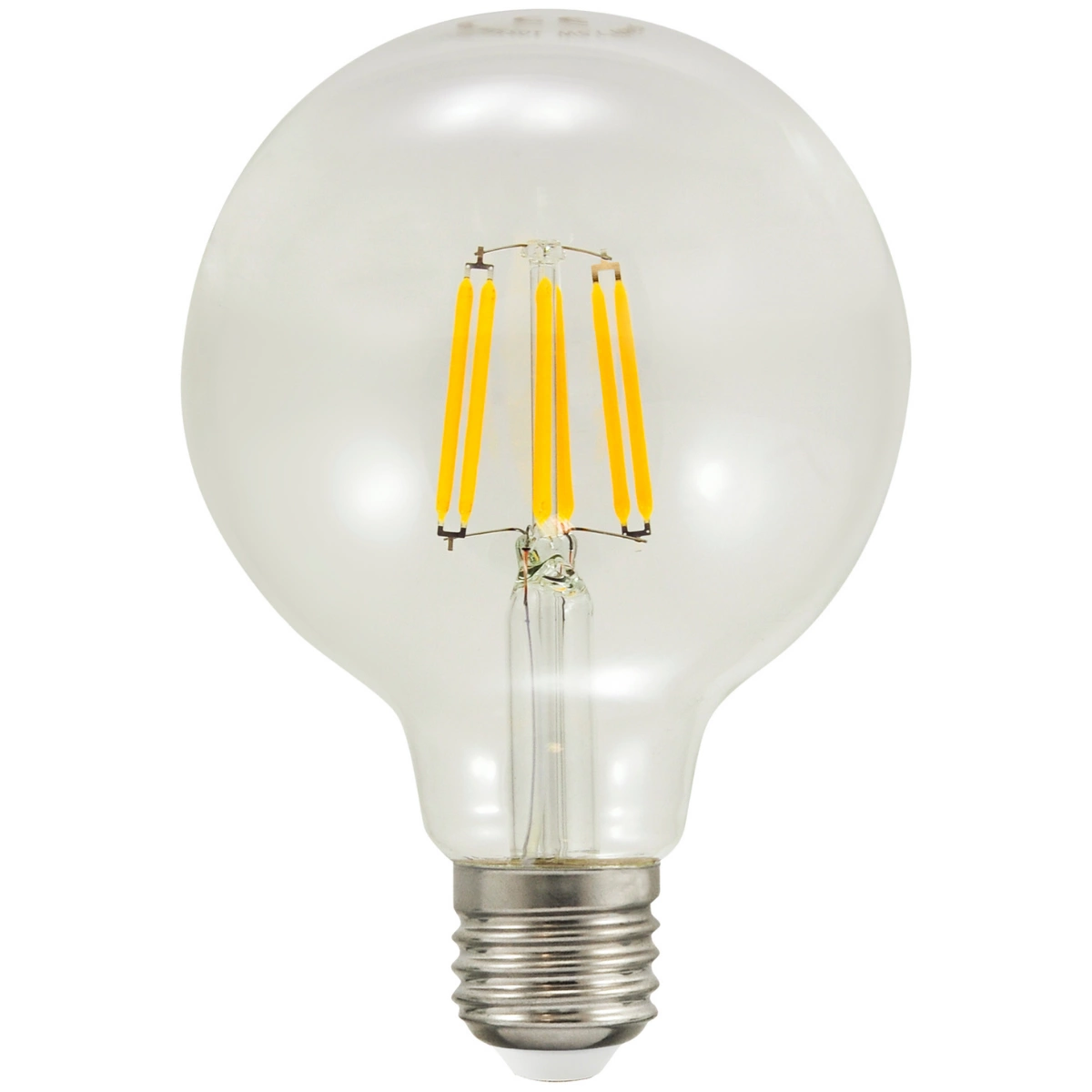 Żarówka G95 FILAMENT renomowanej i uznanej w branży oświetleniowej firmy POLUX z trzonkiem E27 i mocy wynoszącej 7,5W (odpowiednik klasycznej Żarówki o mocy 75W) to wysokiej jakości źródło światła LED. Lampa wykonana została przy użyciu nowoczesnych rozwiązań wykorzystujących innowacyjną technologię diod LED, które charakteryzują się wysoką wydajnością parametrów świetlnych, wiernym odwzorowaniem kolorów oświetlanych przedmiotów oraz wyjątkowo długą trwałością.