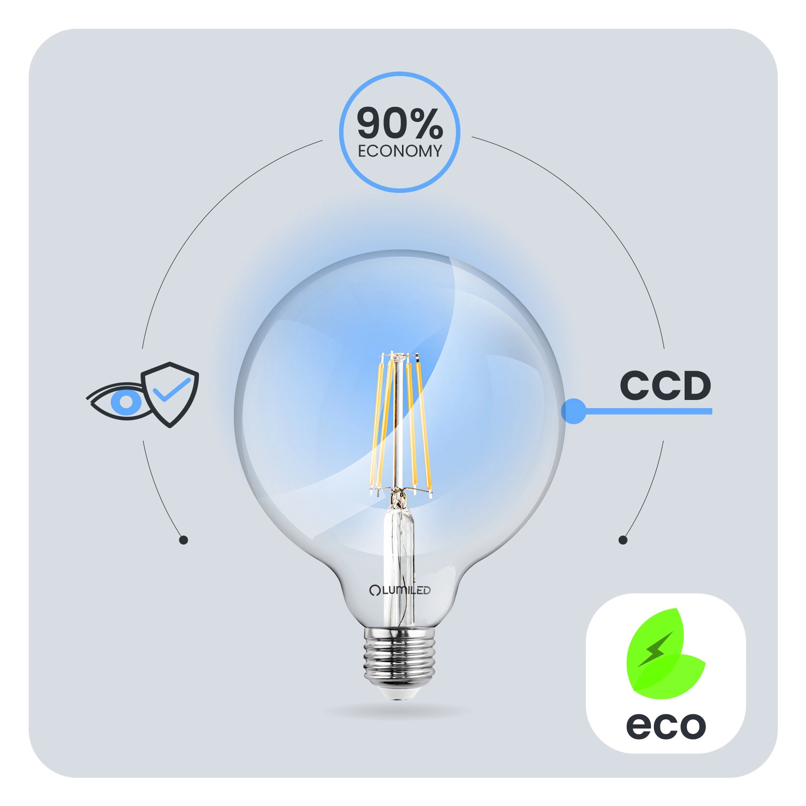 Zastosowana przetwornica CCD w żarówce LED sprawia, że żarówka jest odporna na spadki i wzrosty napięcia w sieci. Światło nie migocze, ani nie drży. Przetwornica CCD sprawia, że żarówka jest bezawaryjna przez długi czas. Żarówki LUMILED zaprojektowane zostały z myślą o jej użytkownikach. Słaba jakość oświetlenia może prowadzić do zmęczenia oczu dlatego nasze Żarówki posiadają opracowanie techniczne Eye Safe zapewnią komfortowe i przyjazne oświetlenie twoim oczom w każdym pomieszczeniu.