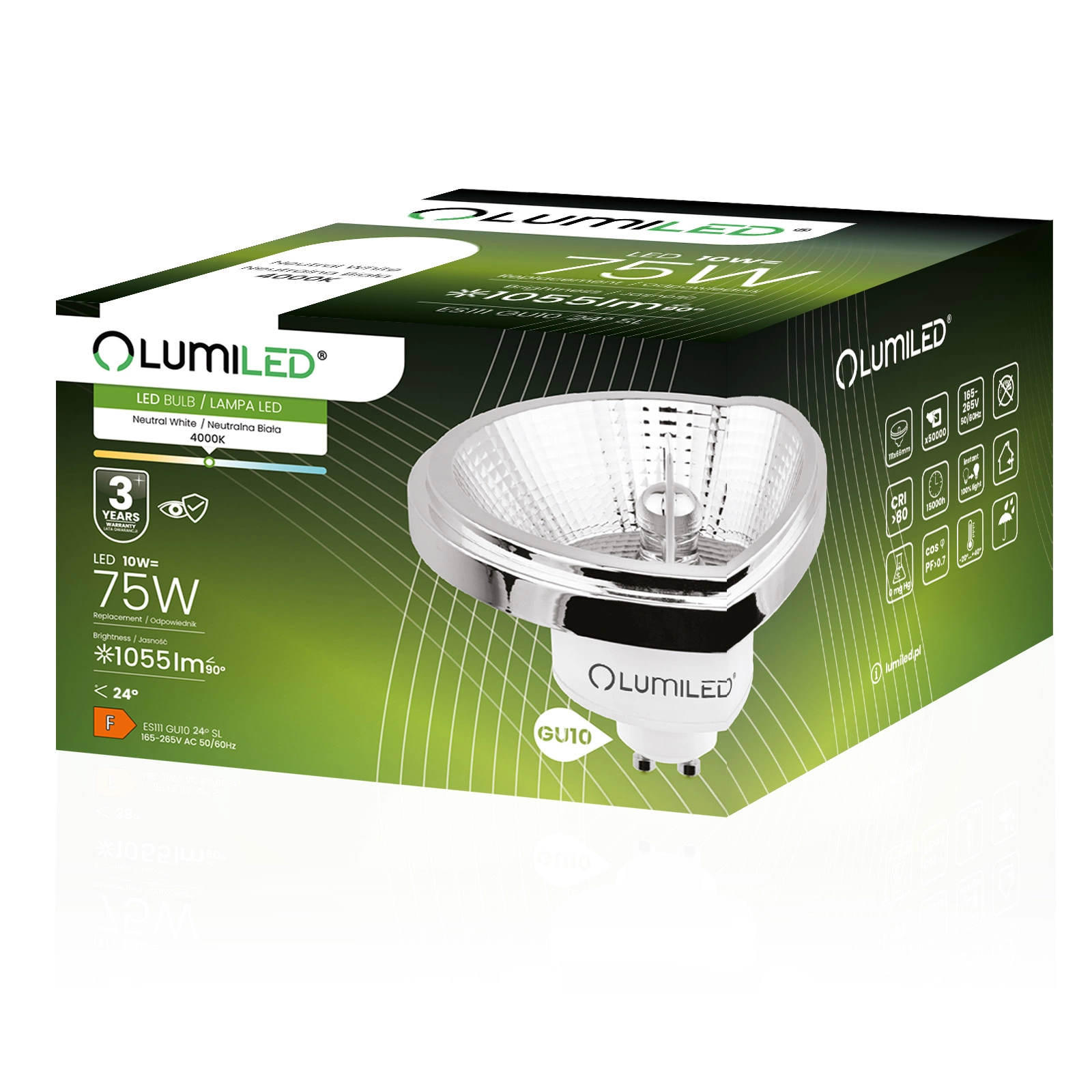 Żarówka LED GU10 Reflektor ES111 10W = 75W 1055lm 4000K Neutralna 24° Srebrna LUMILED