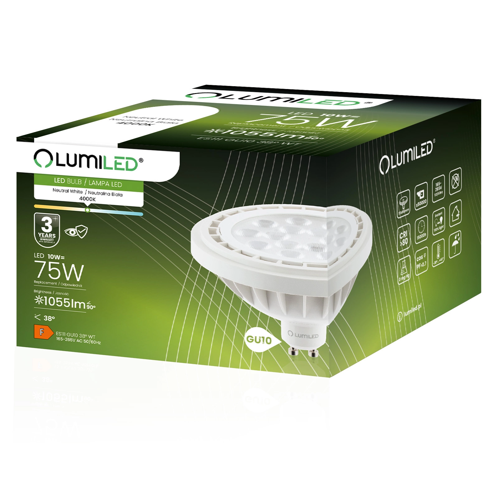 Żarówka LED GU10 Reflektor ES111 10W = 75W 1055lm 4000K Neutralna 38° LUMILED