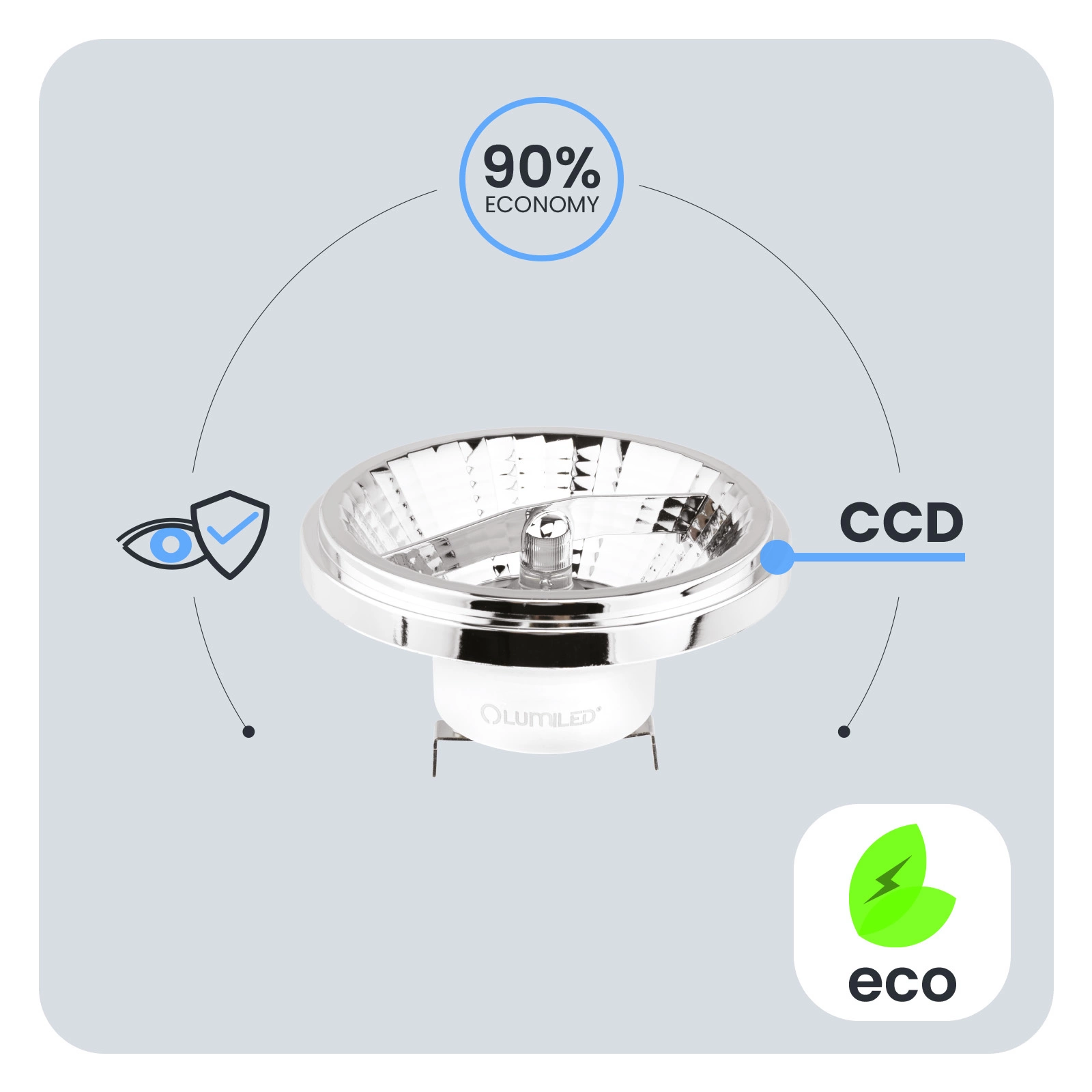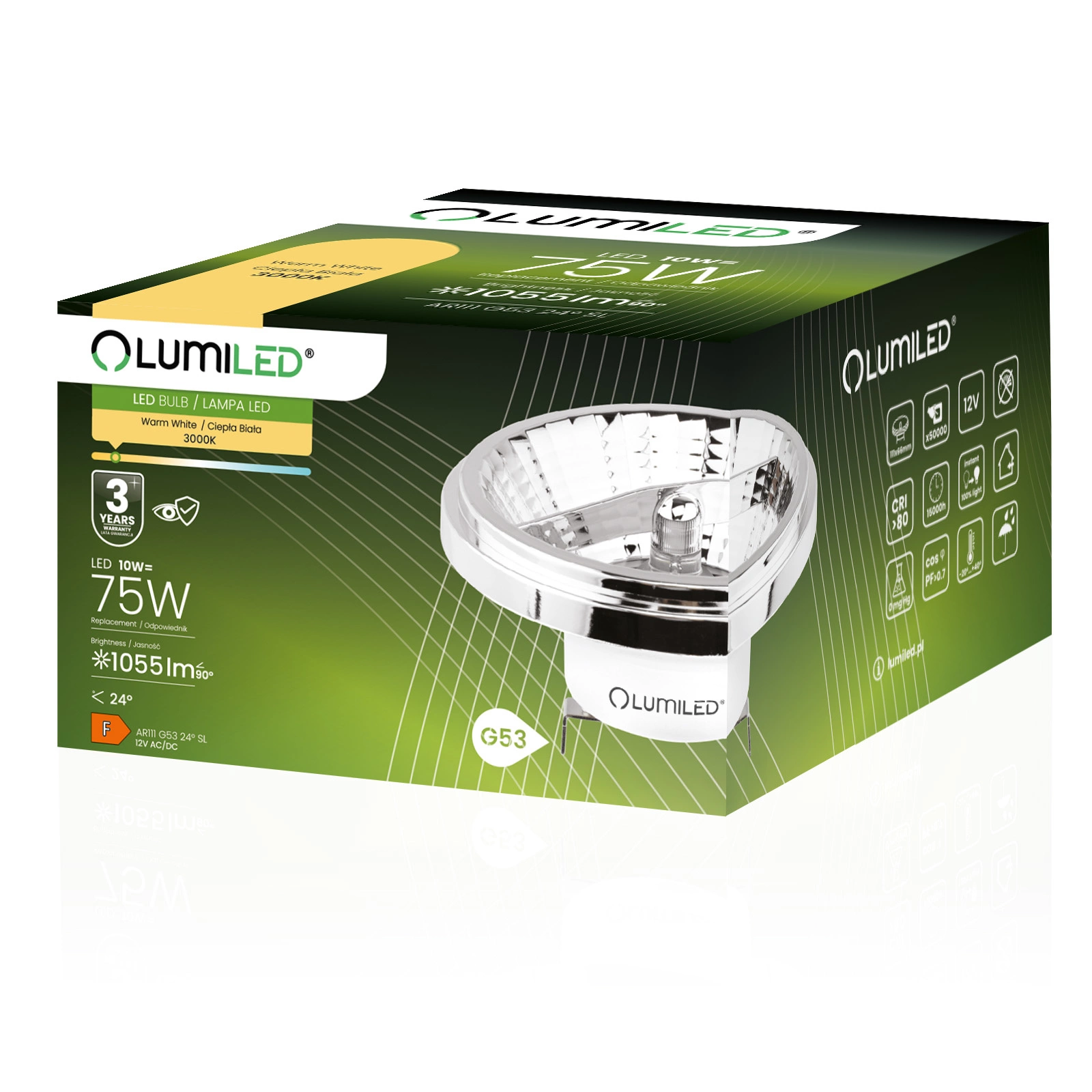 Żarówka LED G53 AR111 marki Lumiled to energooszczędne i nowoczesne źródło światła, które zastępuje tradycyjne halogeny o mocy 75W. Dzięki mocy 10W i strumieniowi 1055 lumenów oferuje jasne, komfortowe oświetlenie, a barwa 3000K wprowadza ciepły i przyjemny nastrój. Kąt świecenia 24° pozwala skierować światło dokładnie na wybrane miejsca, dzięki czemu żarówka idealnie sprawdzi się w salonach, jadalniach, a także w witrynach sklepowych czy restauracjach. To rozwiązanie dla osób, które cenią oszczędność, estetykę i wysoką jakość oświetlenia.