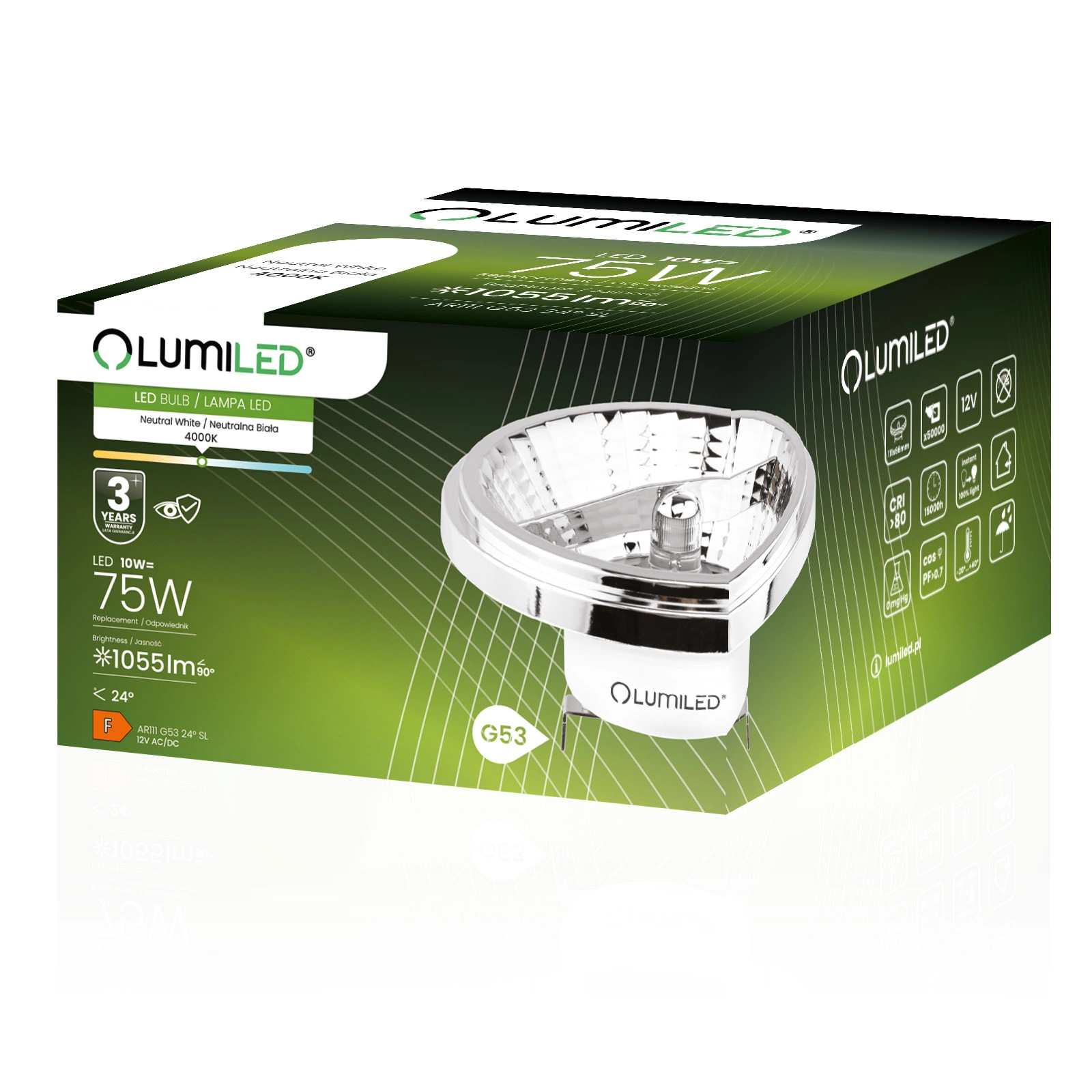 Żarówka LED G53 AR111 marki Lumiled to energooszczędne i nowoczesne źródło światła, które zastępuje tradycyjne halogeny o mocy 75W. Dzięki mocy 10W i strumieniowi 1055 lumenów oferuje jasne, komfortowe oświetlenie, a barwa 4000K wprowadza przyjemny nastrój. Kąt świecenia 24° pozwala skierować światło dokładnie na wybrane miejsca, dzięki czemu żarówka idealnie sprawdzi się w salonach, jadalniach, a także w witrynach sklepowych czy restauracjach. To rozwiązanie dla osób, które cenią oszczędność, estetykę i wysoką jakość oświetlenia.