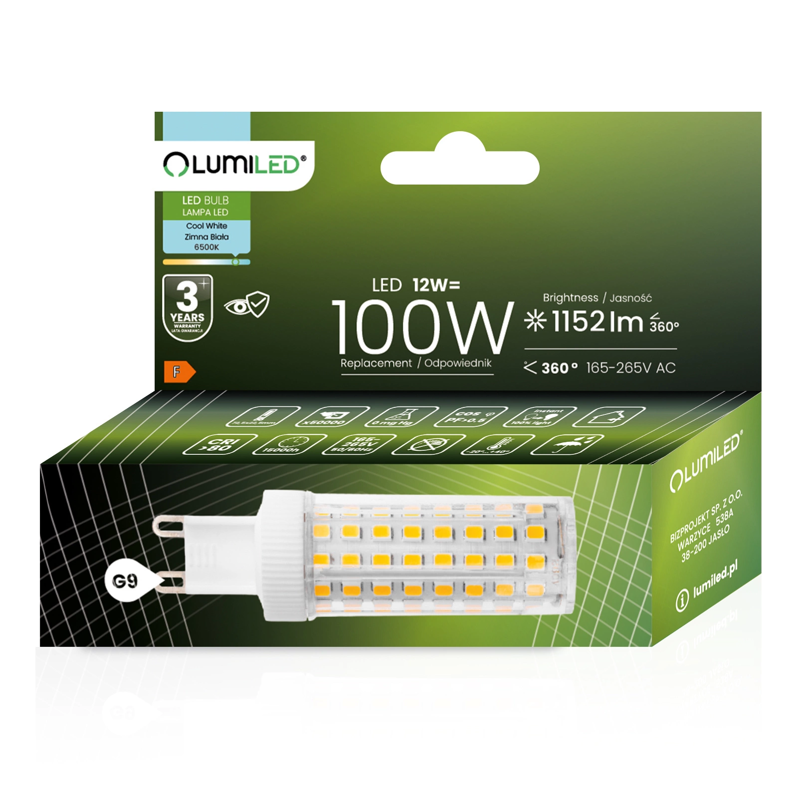 Żarówka LED renomowanej marki LUMILED z trzonkiem G9 i mocy 12W to doskonały zamiennik tradycyjnych żarówek o mocy 100W, oferując przy tym oszczędność energii oraz dłuższą żywotność. Emituje światło o strumieniu świetlnym 1152 lumenów i zimnej barwie 6500K co sprawia, że idealnie nadaje się do oświetlenia wnętrz, gdzie wymagana jest mocna, biała barwa światła. Kąt świecenia wynoszący 360° pozwala na szerokie rozproszenie światła, skutecznie oświetlając pomieszczenie. Dzięki wysokiej jakości wykonania, ma żywotność aż 15 000 godzin, co przekłada się na wieloletnie użytkowanie. Dodatkowo pracuje w szerokim zakresie napięcia 165-265V i jest przystosowana do użytkowania w temperaturach otoczenia od -20°C do +40°C. Idealny wybór dla osób ceniących oszczędność energii oraz dbałość o środowisko.