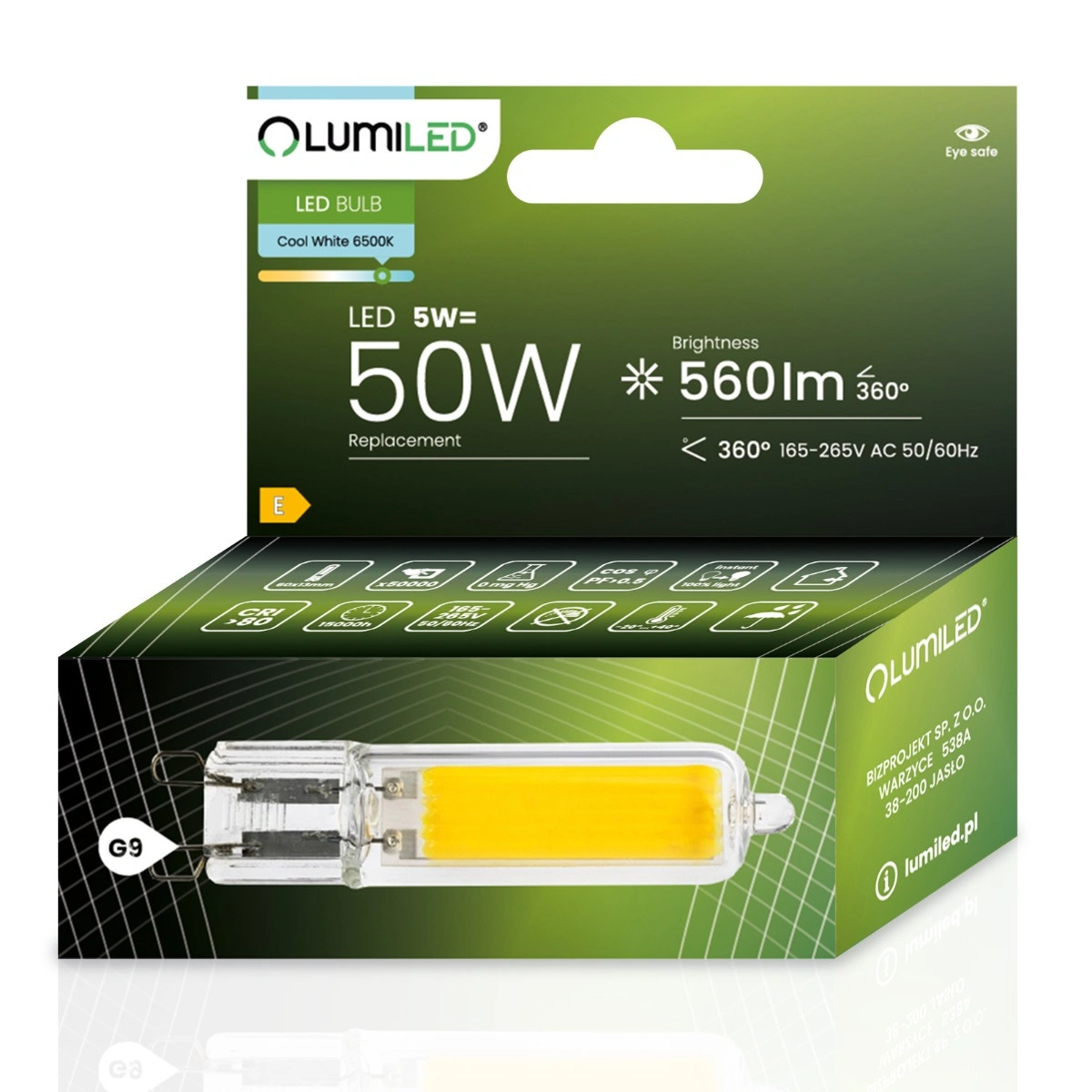 Żarówka LED renomowanej marki LUMILED z trzonkiem G9 i mocy 5W to doskonały zamiennik tradycyjnych żarówek o mocy 50W, oferując przy tym oszczędność energii oraz dłuższą żywotność. Emituje światło o strumieniu świetlnym 560 lumenów i zimnej barwie 6500K co sprawia, że idealnie nadaje się do oświetlenia wnętrz, gdzie wymagana jest mocna, biała barwa światła. Kąt świecenia wynoszący 360° pozwala na szerokie rozproszenie światła, skutecznie oświetlając pomieszczenie. Dzięki wysokiej jakości wykonania, ma żywotność aż 15 000 godzin, co przekłada się na wieloletnie użytkowanie. Dodatkowo pracuje w szerokim zakresie napięcia 165-265V i jest przystosowana do użytkowania w temperaturach otoczenia od -20°C do +40°C. Idealny wybór dla osób ceniących oszczędność energii oraz dbałość o środowisko.
