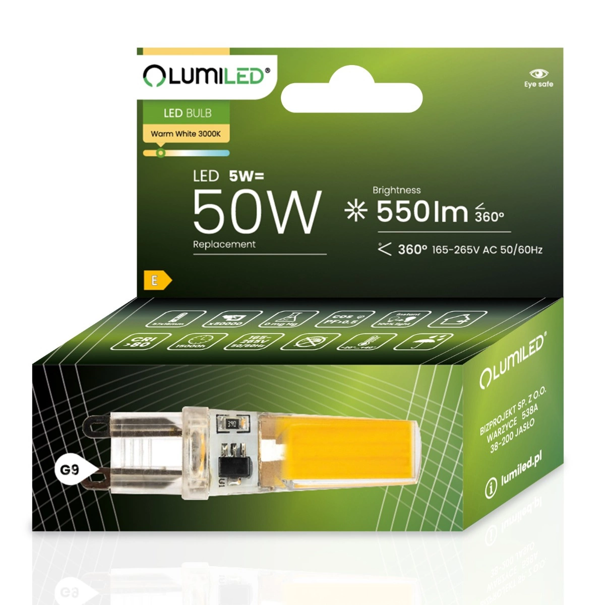 Żarówka LED renomowanej marki LUMILED z trzonkiem G9 i mocy 5W to doskonały zamiennik tradycyjnych żarówek o mocy 50W, oferując przy tym oszczędność energii oraz dłuższą żywotność. Emituje światło o strumieniu świetlnym 550 lumenów i ciepłej barwie 3000K co sprawia, że idealnie nadaje się do oświetlenia wnętrz, gdzie wymagana jest delikatna, przyjemna barwa światła. Kąt świecenia wynoszący 360° pozwala na szerokie rozproszenie światła, skutecznie oświetlając pomieszczenie. Dzięki wysokiej jakości wykonania, ma żywotność aż 15 000 godzin, co przekłada się na wieloletnie użytkowanie. Dodatkowo pracuje w szerokim zakresie napięcia 165-265V i jest przystosowana do użytkowania w temperaturach otoczenia od -20°C do +40°C. Idealny wybór dla osób ceniących oszczędność energii oraz dbałość o środowisko.