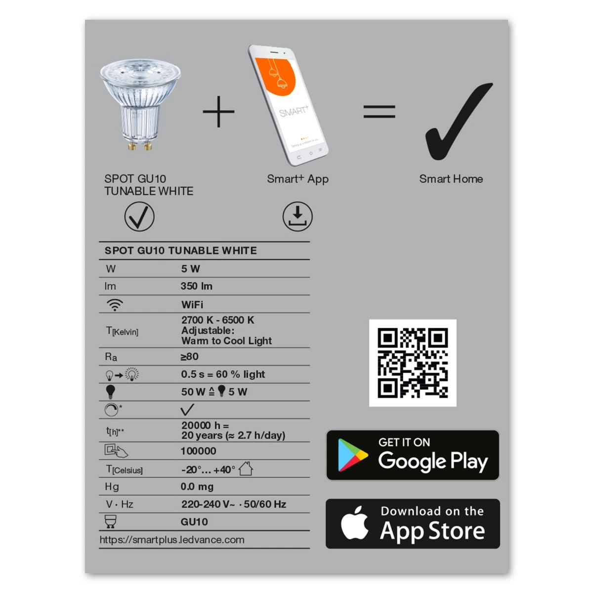 - Sterowanie za pomocą aplikacji LEDVANCE SMART+ (z systemem Android™️ co najmniej 8.0 lub iOS 14.0).