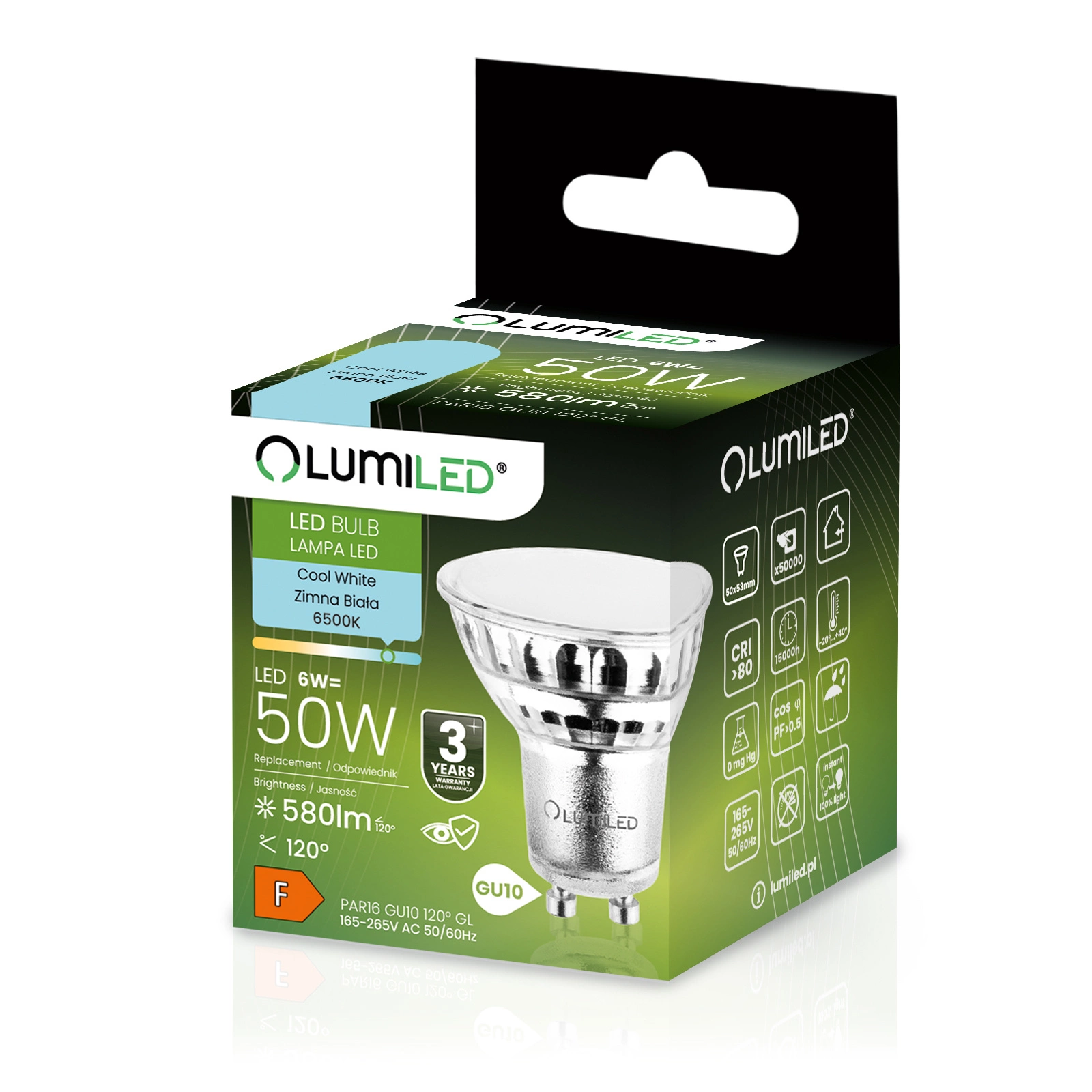 Żarówka LED renomowanej marki LUMILED z trzonkiem GU10 i mocy 6W to doskonały zamiennik tradycyjnych żarówek o mocy 50W, oferując przy tym oszczędność energii oraz dłuższą żywotność. Emituje światło o strumieniu świetlnym 580 lumenów i zimnej barwie 6500K co sprawia, że idealnie nadaje się do oświetlenia wnętrz, gdzie wymagana jest mocna, biała barwa światła. Kąt świecenia wynoszący 120° pozwala na szerokie rozproszenie światła, skutecznie oświetlając pomieszczenie. Dzięki wysokiej jakości wykonania, ma żywotność aż 15 000 godzin, co przekłada się na wieloletnie użytkowanie. Dodatkowo pracuje w szerokim zakresie napięcia 165-265V i jest przystosowana do użytkowania w temperaturach otoczenia od -20°C do +40°C. Idealny wybór dla osób ceniących oszczędność energii oraz dbałość o środowisko.