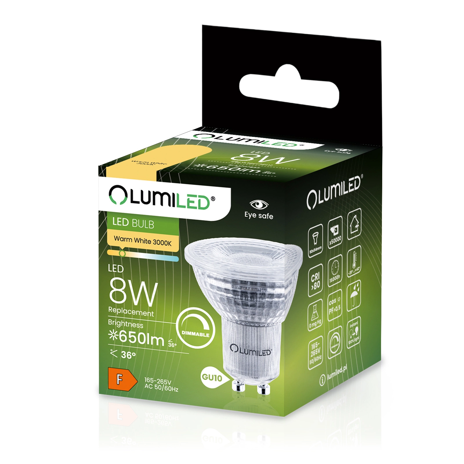 Żarówka LED GU10 Reflektor PAR16 8W = 80W 650lm 3000K Ciepła 36° Ściemnialna LUMILED