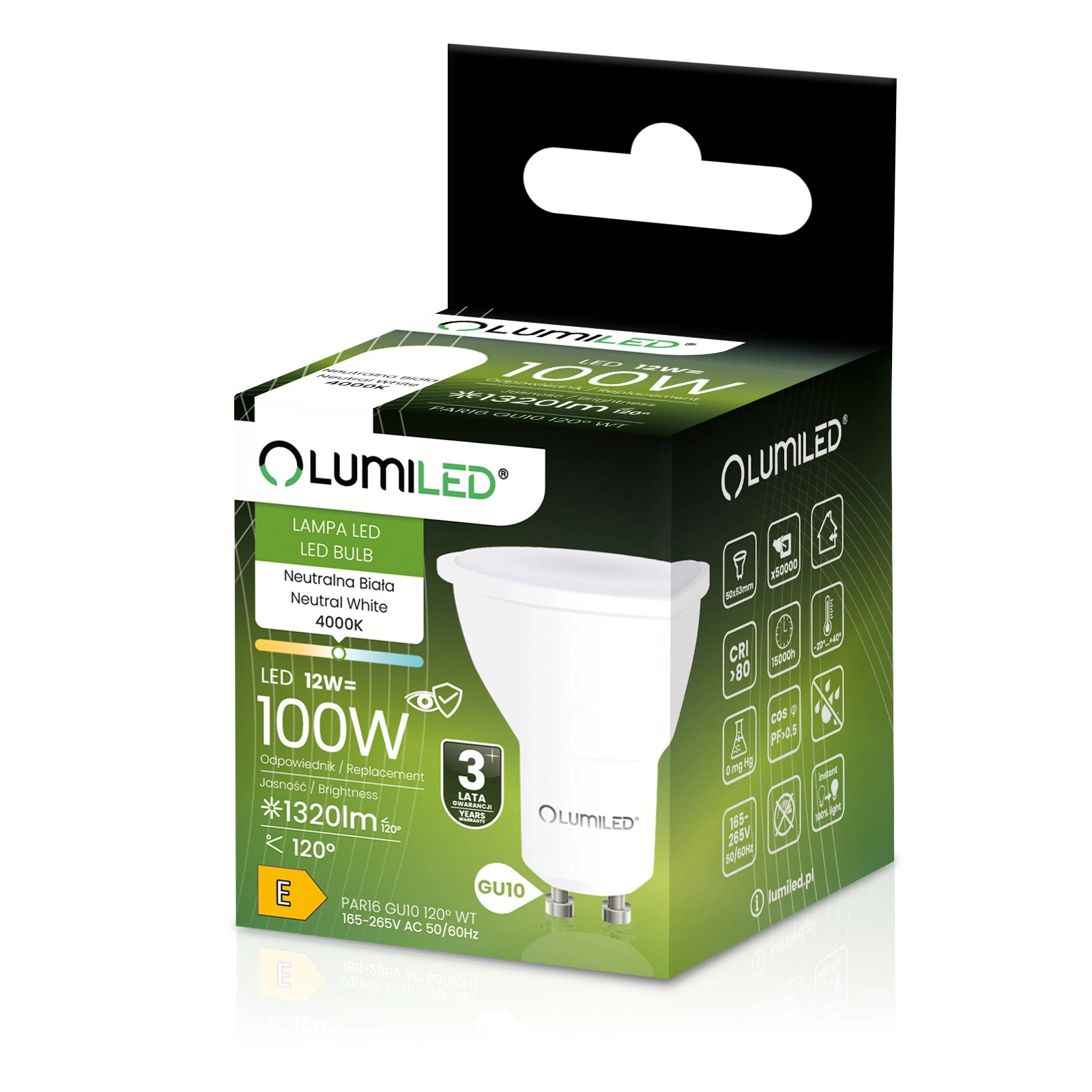 Żarówka LED GU10 Reflektor PAR16 12W = 100W 1320LM 4000K Neutralna 120° LUMILED