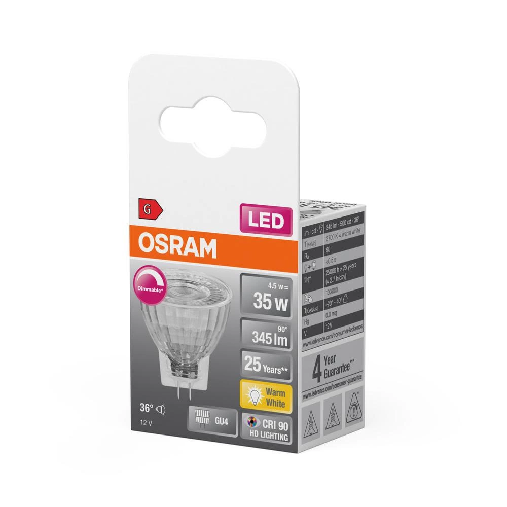Żarówka LED MR11 Reflektor GU4 4.5W = 35W 345lm 2700K Ciepła CRI90 12V 36° Ściemnialna SUPERSTAR Osram
