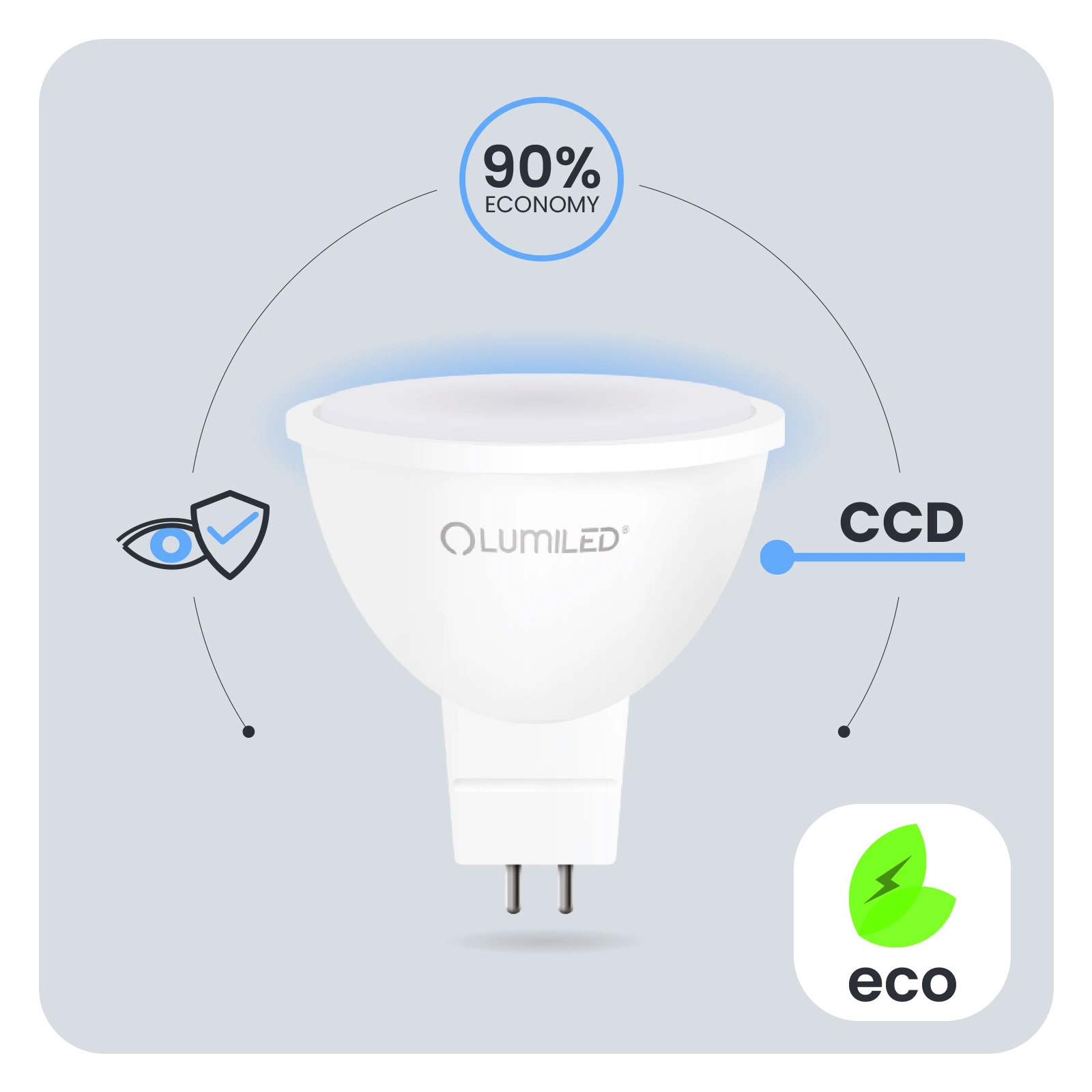 Zastosowana przetwornica CCD w żarówce LED sprawia, że żarówka jest odporna na spadki i wzrosty napięcia w sieci. Światło nie migocze, ani nie drży. Przetwornica CCD sprawia, że żarówka jest bezawaryjna przez długi czas. Żarówki LUMILED zaprojektowane zostały z myślą o jej użytkownikach. Słaba jakość oświetlenia może prowadzić do zmęczenia oczu dlatego nasze Żarówki posiadają opracowanie techniczne Eye Safe zapewnią komfortowe i przyjazne oświetlenie twoim oczom w każdym pomieszczeniu.