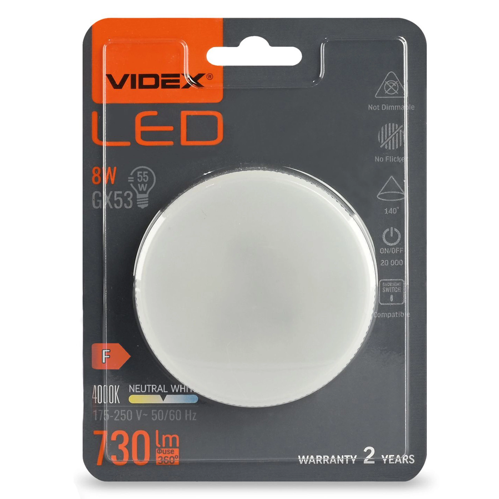 Produkt wyróżnia się długą żywotnością sięgającą 20000 godzin oraz stabilnym działaniem w szerokim zakresie napięć od 175-250V. Żarówka pracuje w temperaturach od -20°C do +40°C, co czyni ją odporną na zmienne warunki otoczenia. Charakteryzuje się doskonałym odwzorowaniem barw na poziomie 80 CRI. Dzięki uchwytowi GX53 idealnie nadaje się do różnorodnych zastosowań, oferując energooszczędność i wydajność.