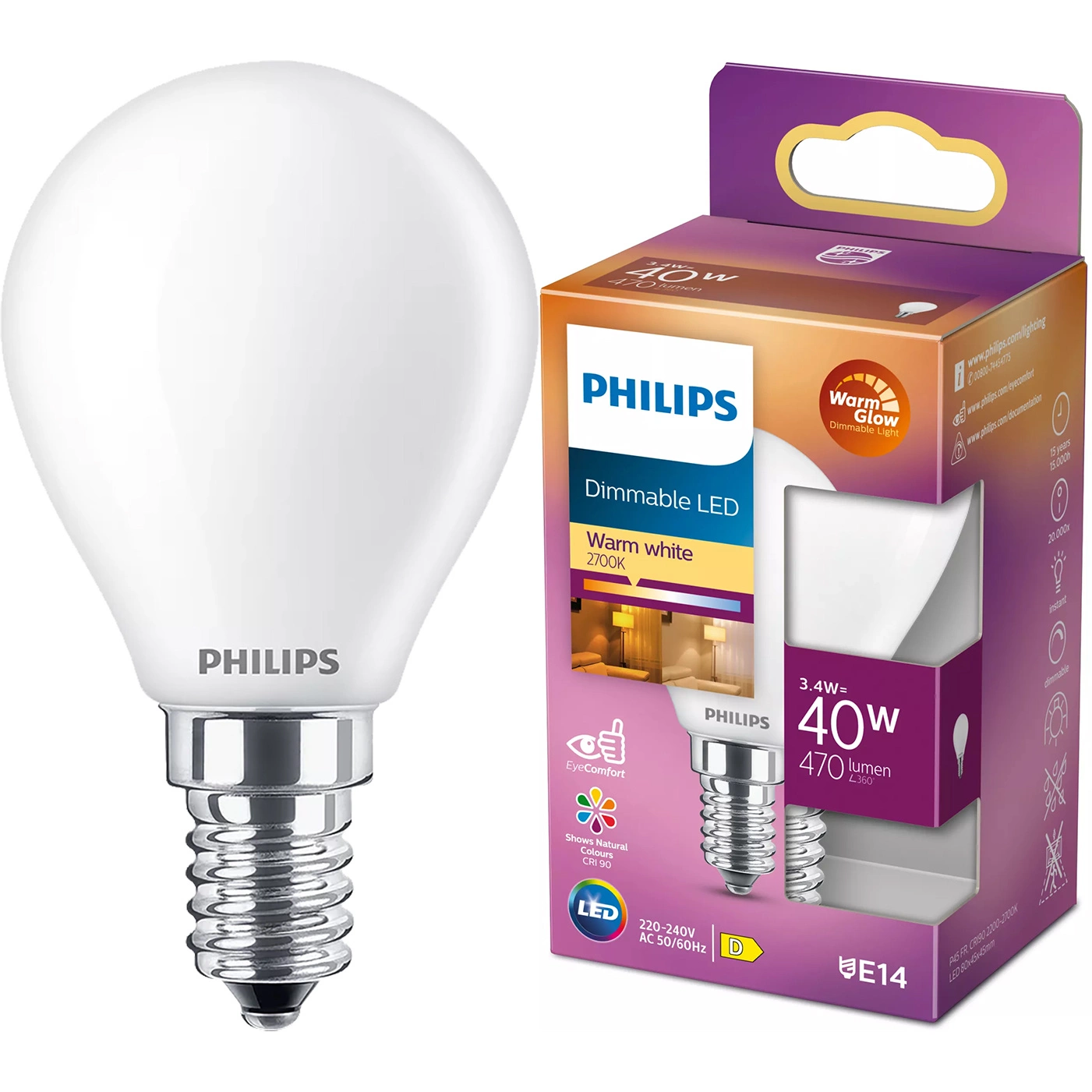 Odkryj nowy wymiar oświetlenia z żarówką LED E14 Kulka P45 od Philips z serii WarmGlow Dimmable. Ta nowoczesna żarówka LED o mocy 3.4W, dostarczająca strumień świetlny 470lm, to idealny zamiennik dla tradycyjnych żarówek 40W. Jej ciepła biała barwa światła o temperaturze 2200-2700K oraz wysoki wskaźnik oddawania barw CRI90 zapewniają przytulną atmosferę w każdym pomieszczeniu. Dodatkowo możliwość ściemniania pozwala dostosować jasność do Twoich potrzeb, a technologia EyeComfort dba o komfort Twoich oczu.