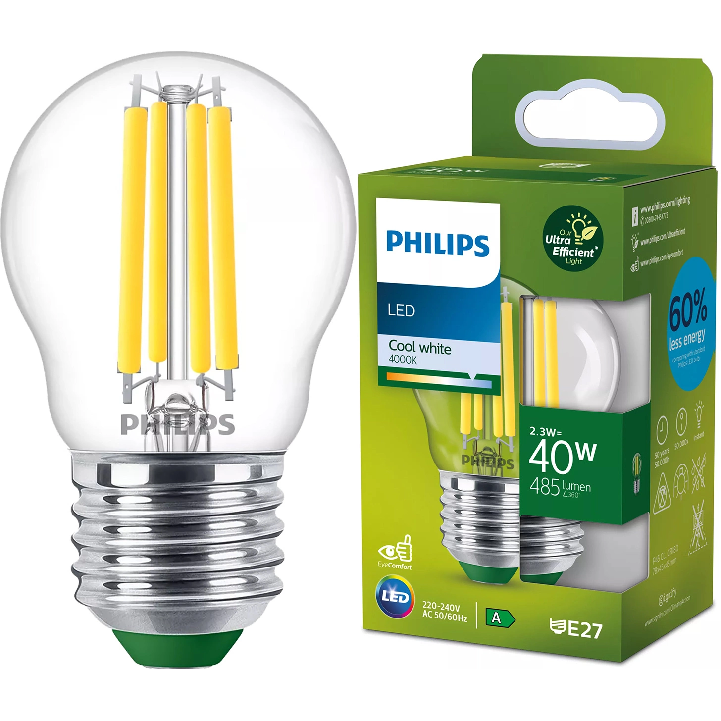Żarówka LED E27 Kulka P45 2.3W = 40W 485lm 210lm/W 4000K Neutralna 300° KLASA A UltraEfficient Philips