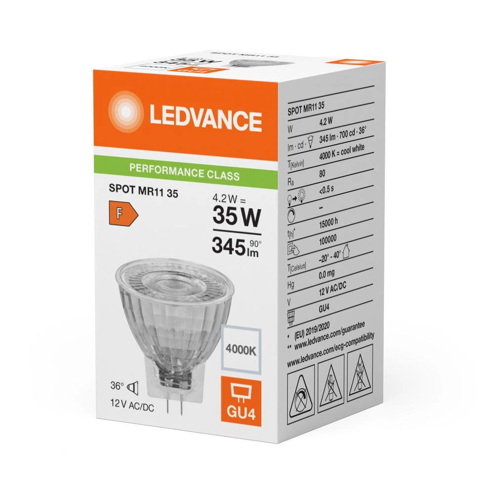 Przedstawiamy nowoczesną żarówkę LED MR11 GU4 4,2W marki LEDVANCE, która stanowi zaawansowaną alternatywę dla tradycyjnych żarówek o mocy 35W. Dzięki zastosowaniu technologii Filament LED, produkt oferuje jasny strumień świetlny na poziomie 345 lm przy neutralnej białej barwie światła o temperaturze 4000K. Ta energooszczędna żarówka, działająca na zasilaniu 12V, zapewnia doskonałą trwałość wynoszącą do 15 000 godzin, co znacząco redukuje częstotliwość konieczności wymiany źródła światła.