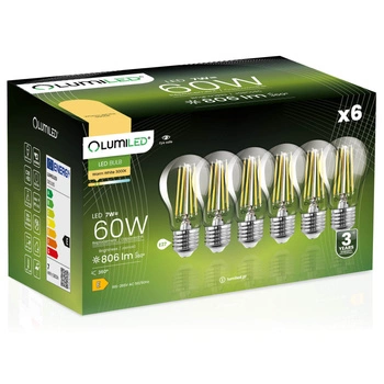 Zestaw 6x Żarówka LED A60 E27 7W = 60W 806lm 3000K Ciepła 360° Filament LUMILED