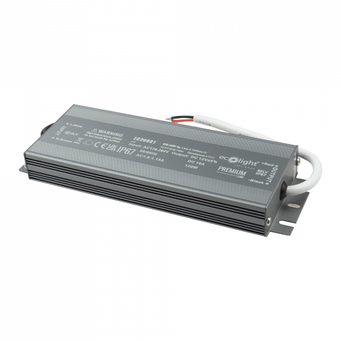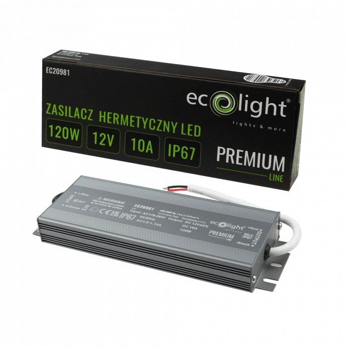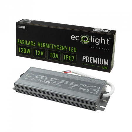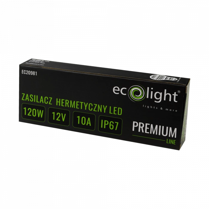Przedstawiamy zasilacz do taśm LED hermetyczny 120W 12V 10A IP67 PREMIUM marki Ecolight, idealny wybór dla klientów szukających niezawodnych rozwiązań o najwyższych standardach jakości. Produkt z serii PREMIUM LINE charakteryzuje się wysoką odpornością na niekorzystne warunki zewnętrzne dzięki hermetycznej konstrukcji o stopniu ochrony IP67. Oznacza to pełną ochronę przed kurzem i wodą, co czyni zasilacz doskonałym do zastosowań zewnętrznych oraz w trudnych warunkach przemysłowych.