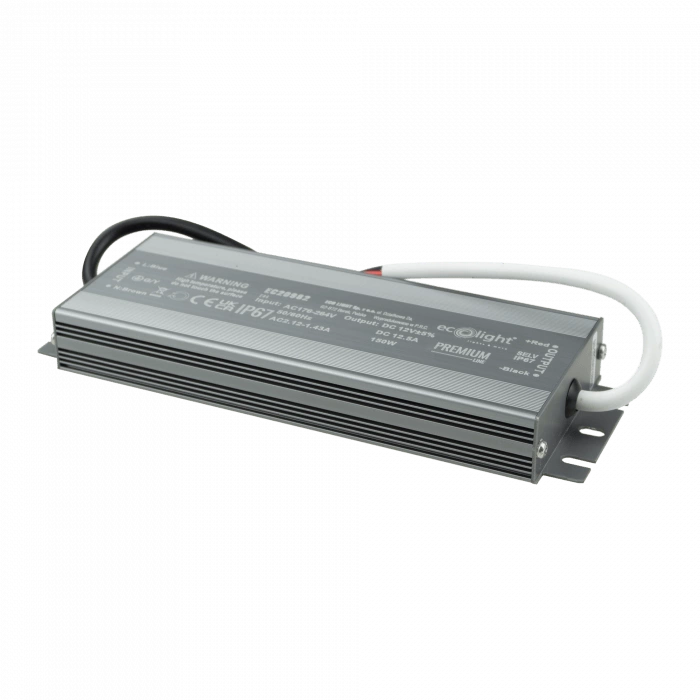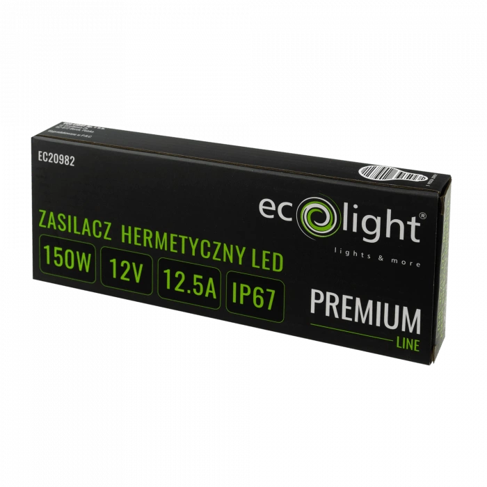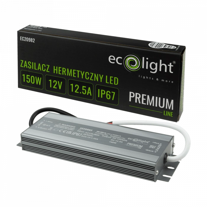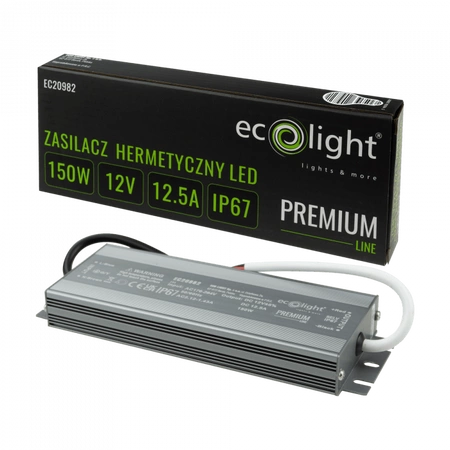 Zasilacz do Taśm LED Hermetyczny 150W 12V 12.5A IP67 PREMIUM Ecolight to pierwszy wybór dla wymagających profesjonalistów, którzy cenią sobie niezawodność oraz długą żywotność urządzeń zasilających. Charakteryzuje się wysoką wydajnością, wydajnym energetycznie działaniem i solidną hermetyczną konstrukcją. Dzięki stopniowi ochrony IP67 nadaje się do użytku w trudnych warunkach zewnętrznych i przemysłowych, zapewniając ochronę przed pyłem i wodą. Zasilacz ten jest również wysoce odporny na zmienne prądy wejściowe o wartości od 176 do 264V AC, dzięki czemu idealnie sprawdza się w szerokim zakresie aplikacji.