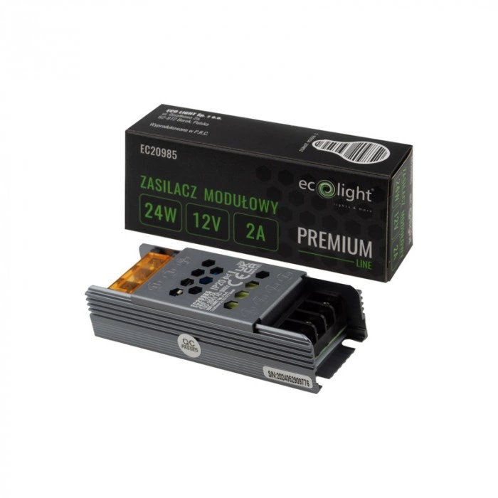 Zasilacz Modułowy do Taśm LED SLIM PREMIUM od renomowanej firmy ECO LIGHT. Jest to produkt najwyższej klasy, zaprojektowany z myślą o zapewnieniu stabilnego i efektywnego zasilania taśm LED o napięciu 12V DC i maksymalnym prądzie wyjściowym 2A. Kompaktowa konstrukcja SLIM oraz eleganckie czarne wykończenie pozwala na dyskretne wkomponowanie urządzenia w każde wnętrze, dodając jednocześnie estetyki całemu systemowi oświetleniowemu. Zasilacz, o mocy 24W, posiada stopień ochrony IP20, co czyni go idealnym wyborem do zastosowania wewnątrz pomieszczeń.