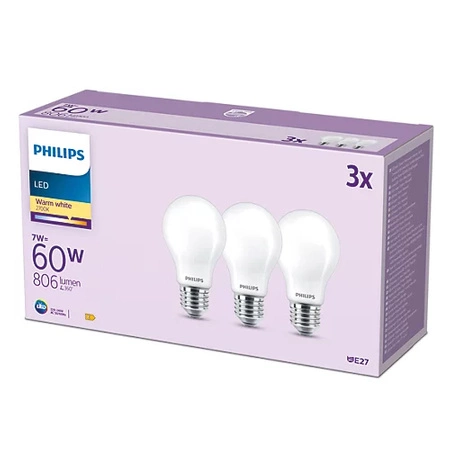 Odkryj nową jakość oświetlenia z zestawem trzech żarówek LED marki Philips, które gwarantują wyjątkową wydajność i oszczędność energii. Te żarówki LED to doskonały zamiennik tradycyjnych żarówek, odpowiadający mocy 60W, przy zaledwie 7W rzeczywistej mocy zużycia! Z ich pomocą zaoszczędzisz na rachunkach za energię, a jednocześnie cieszysz się przyjemnym, ciepłym światłem o temperaturze 2700K, które idealnie nadaje się do relaksu wieczorami.