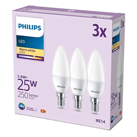 Zestaw 3x Żarówka LED o trzonku E14 marki PHILIPS to idealny zamiennik dla tradycyjnych żarówek. W porównaniu do tradycyjnego odpowiednika żarówka LED PHILIPS zużywa do 90% mniej energii elektrycznej co pozwala na duże oszczędności. Żarówka wykonana została przy użyciu nowoczesnych rozwiązań wykorzystujących innowacyjną technologię diod LED, które charakteryzują się wysoką wydajnością parametrów świetlnych, wiernym odwzorowaniem kolorów oświetlanych przedmiotów oraz wyjątkowo długą trwałością. Decydując się na zakup żarówek LED z firmy PHILIPS możemy być pewni że otrzymujemy towar wysokiej klasy który zadowoli każdego, nawet najbardziej wymagającego klienta.
