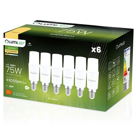 Zestaw 6x Żarówka LED renomowanej marki LUMILED z trzonkiem E14 i mocy 10W to doskonały zamiennik tradycyjnych żarówek o mocy 75W, oferując przy tym oszczędność energii oraz dłuższą żywotność. Emituje światło o strumieniu świetlnym 1055 lumenów i ciepłej barwie 3000K co sprawia, że idealnie nadaje się do oświetlenia wnętrz, gdzie wymagana jest delikatna, przyjemna barwa światła. Kąt świecenia wynoszący 200° pozwala na szerokie rozproszenie światła, skutecznie oświetlając pomieszczenie. Dzięki wysokiej jakości wykonania, ma żywotność aż 15 000 godzin, co przekłada się na wieloletnie użytkowanie. Dodatkowo pracuje w szerokim zakresie napięcia 165-265V i jest przystosowana do użytkowania w temperaturach otoczenia od -20°C do +40°C. Idealny wybór dla osób ceniących oszczędność energii oraz dbałość o środowisko.