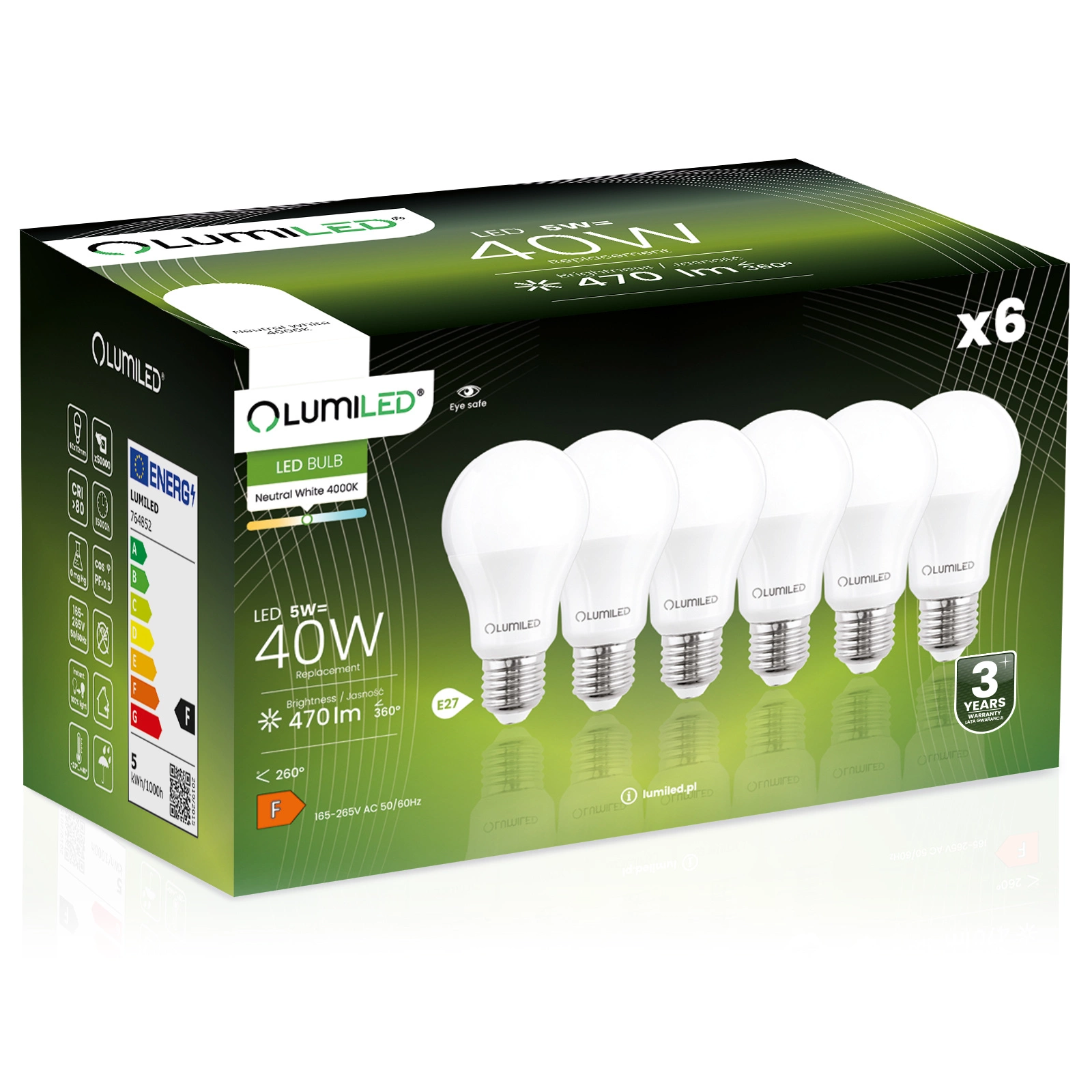 6x Żarówka LED E27 A60 5W = 40W 470lm 4000K Neutralna 260° LUMILED