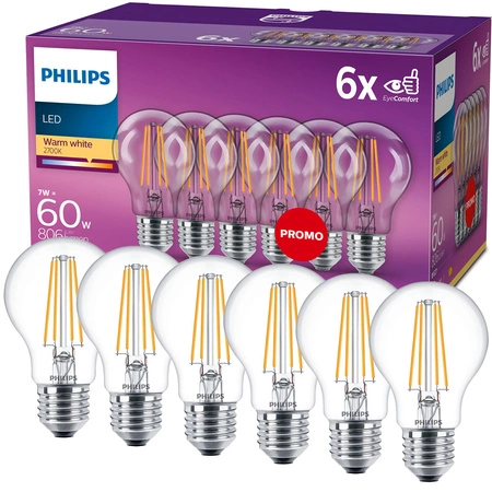 Zestaw 6x Żarówka LED marki PHILIPS 7W, do używania na co dzień w pomieszczeniach. Znajome kształty, które kochasz. Zużywają około 85% mniej energii niż tradycyjne żarówki dzięki najnowszej technologii energooszczędnej LED i mają dziesięć razy dłuższy okres użytkowania. Żarówka filamentowa standardowa z przezroczystego szkła, z gwintem E27, 15 000 godzin eksploatacji i strumień światła o wartości 806 lumenów. Moc lampy odpowiada światłu żarówki 60W.