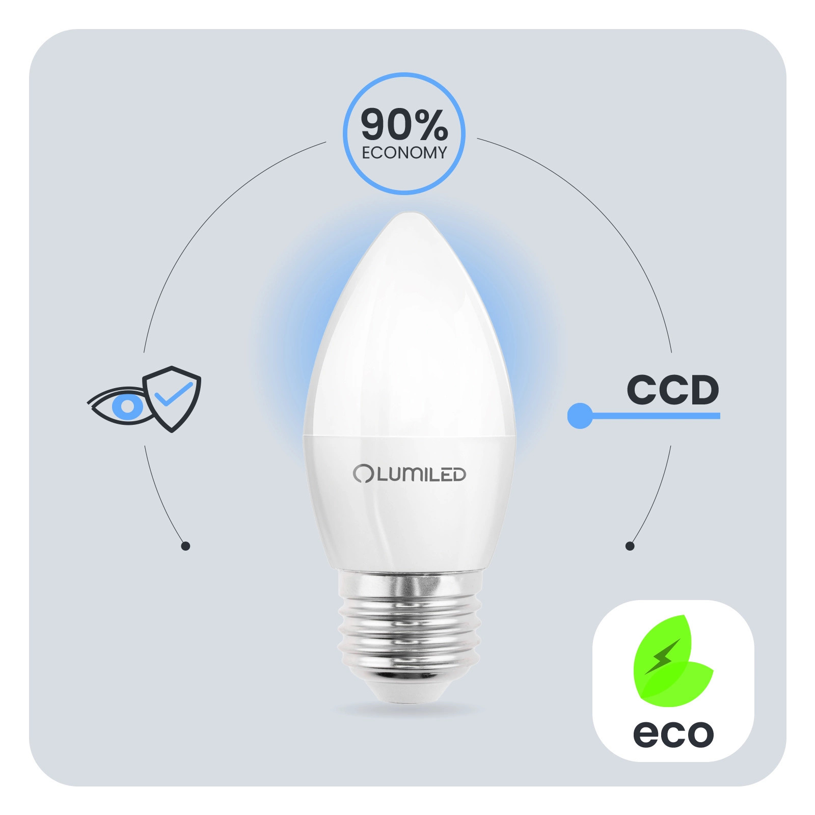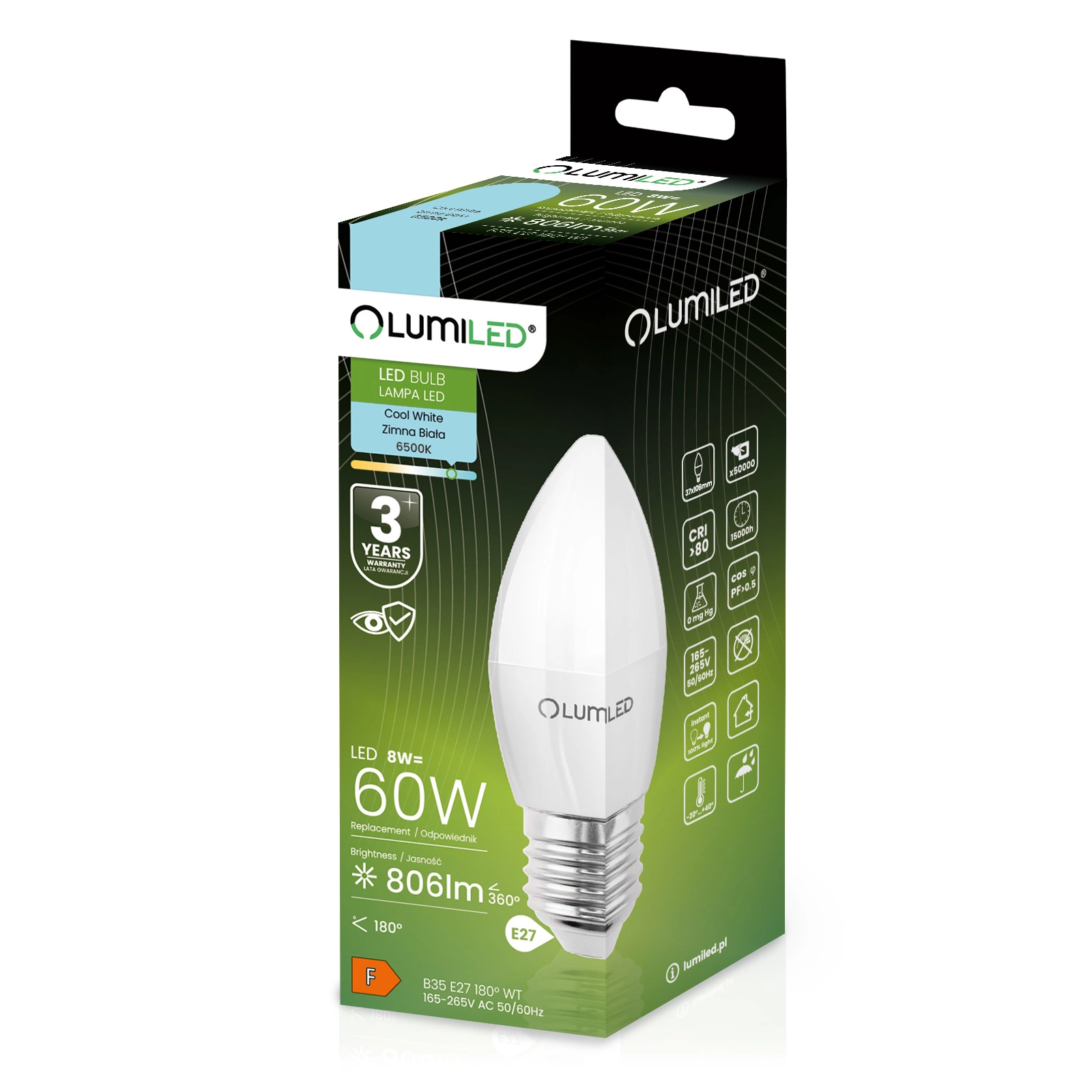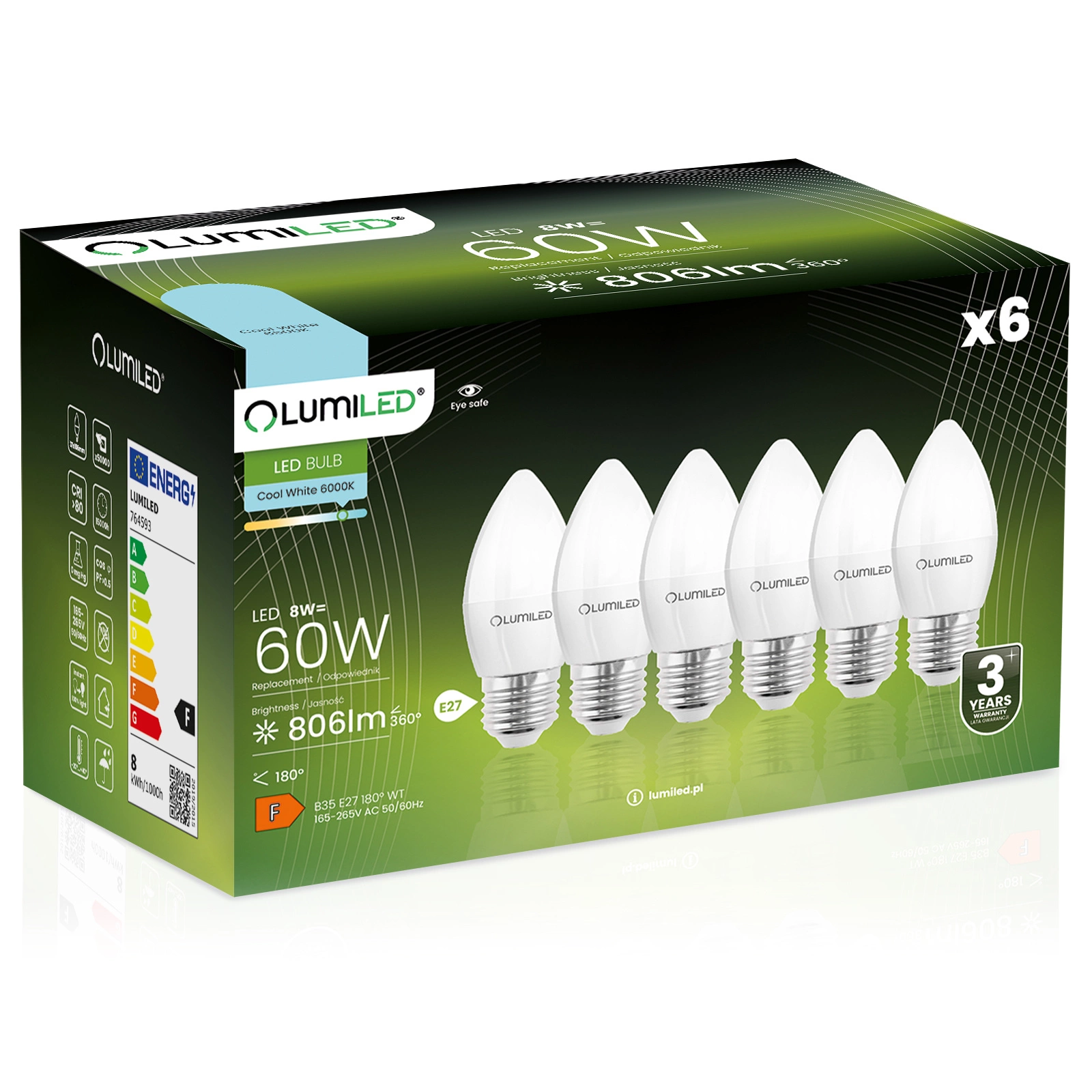 6x Żarówka LED E27 Świeczka B35 8W = 60W 806lm 6500K Zimna 180° LUMILED