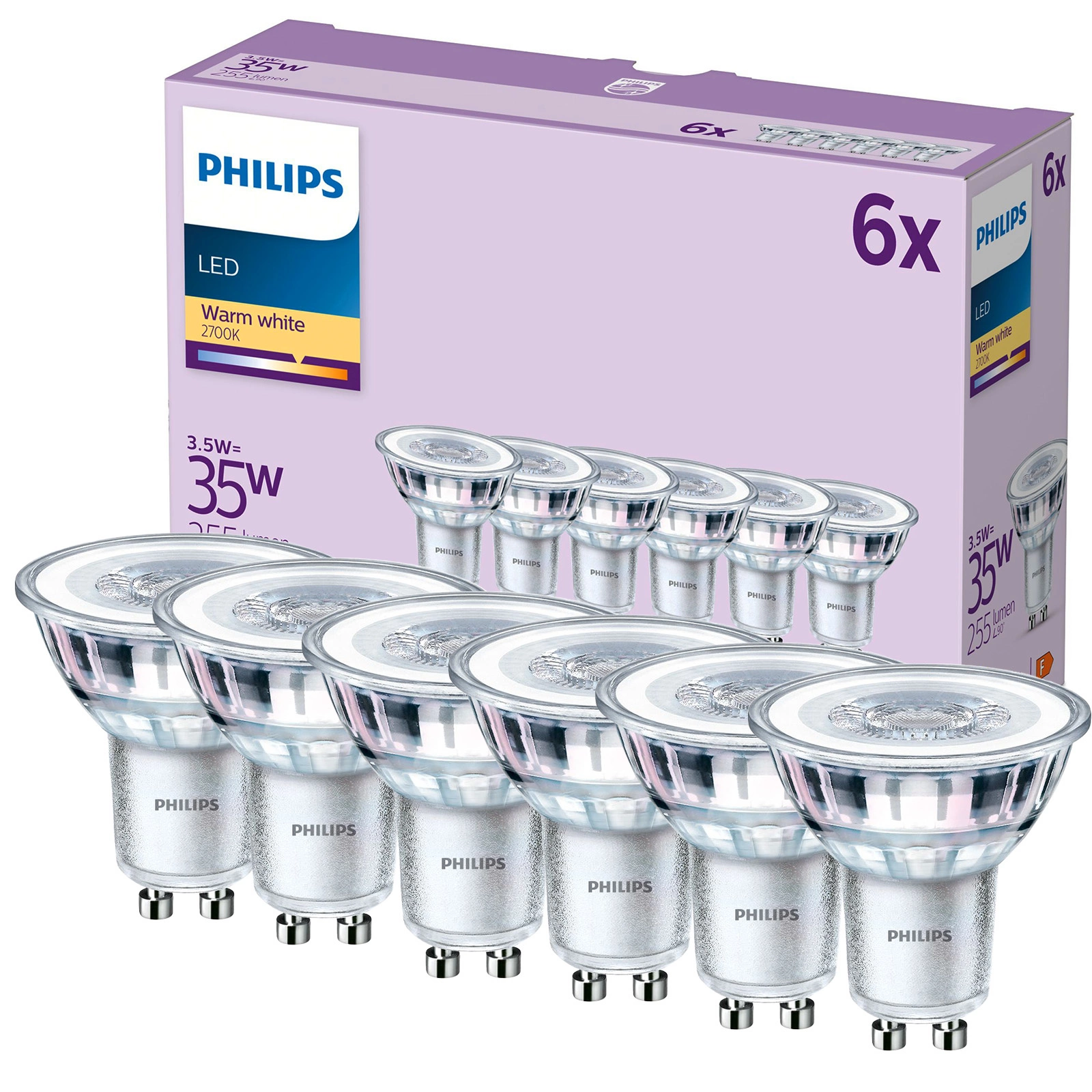 Oświetl swoje wnętrza z wyjątkowym stylem i efektywnością dzięki żarówkom LED marki Philips . Ten zestaw sześciu żarówek o mocy 3.5W odpowiada tradycyjnym żarówkom 35W, co oznacza niższe rachunki za prąd przy zachowaniu doskonałej jakości światła. Emitują przyjemne, ciepłe światło o temperaturze 2700K, które tworzy przytulną atmosferę w każdym pomieszczeniu. Kąt rozsyłu światła wynoszący 36° oraz strumień świetlny 255lm gwarantują optymalne oświetlenie, niezależnie od miejsca montażu.