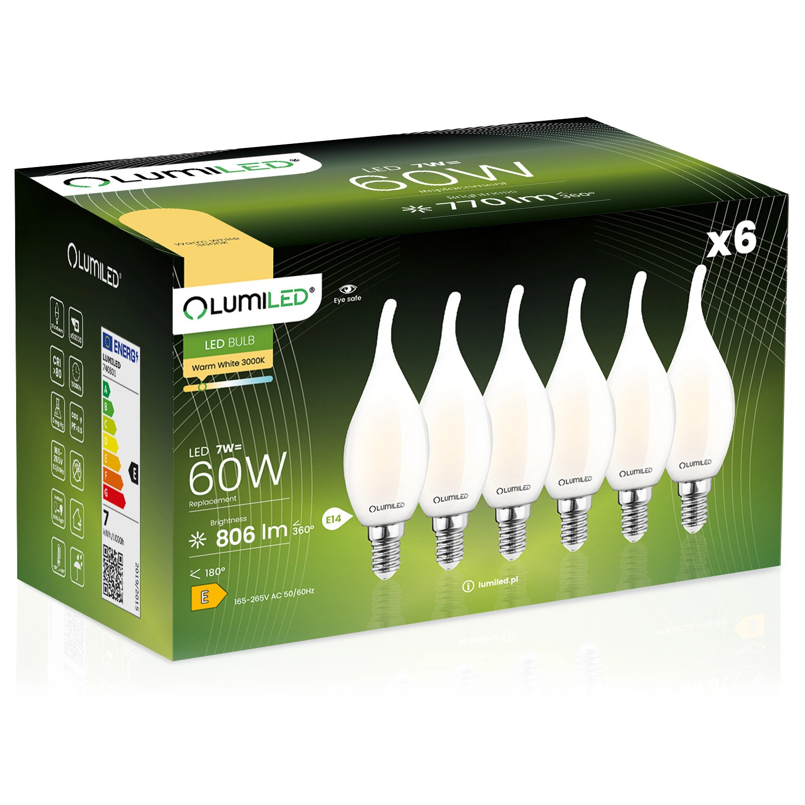 6x Żarówka LED E14 Świeczka BA35 7W = 60W 806lm 3000K Ciepła 360° LUMILED