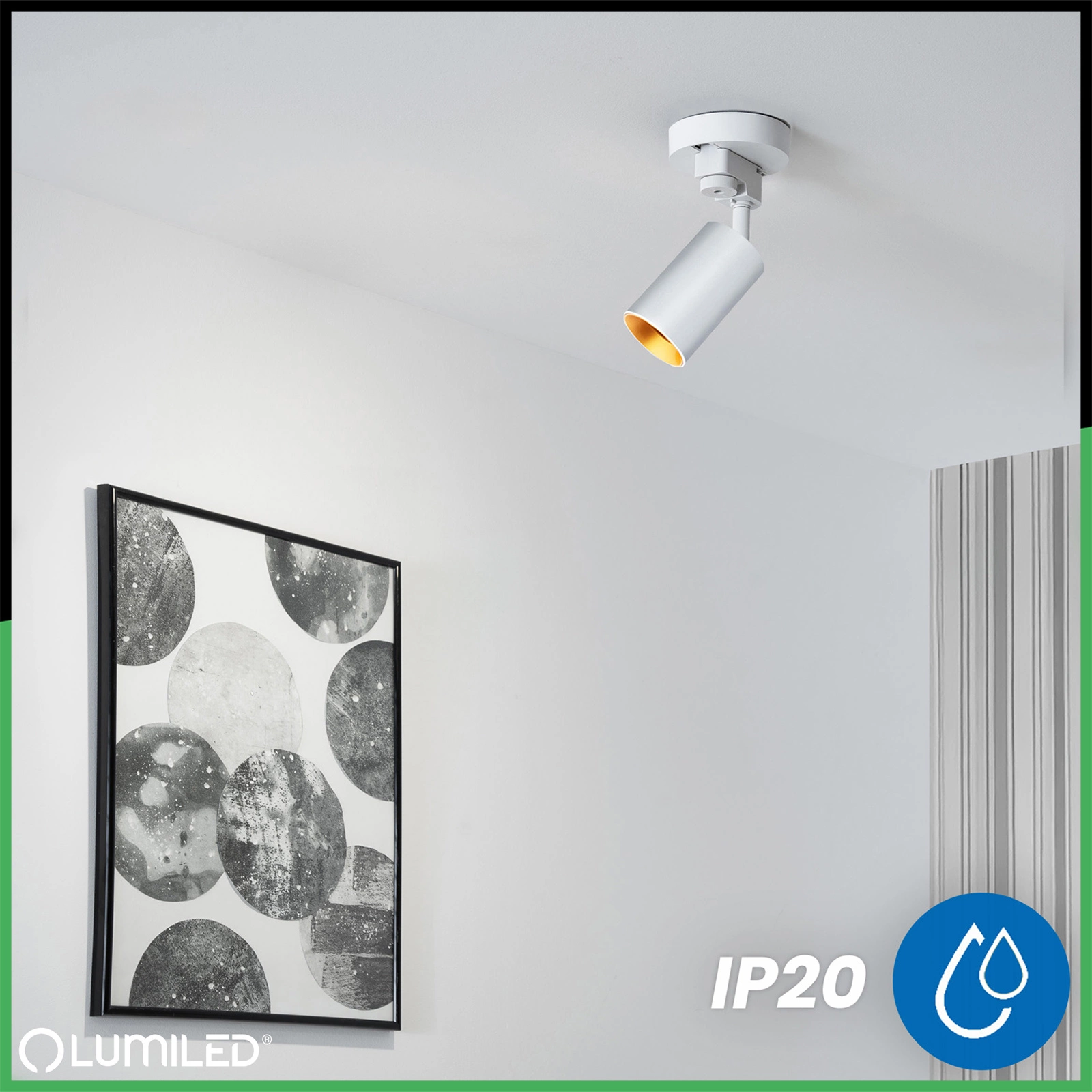 - Nowoczesny wygląd – biała matowa oprawa ze złotym pierścieniem dodaje wnętrzu elegancji i idealnie pasuje do nowoczesnych aranżacji