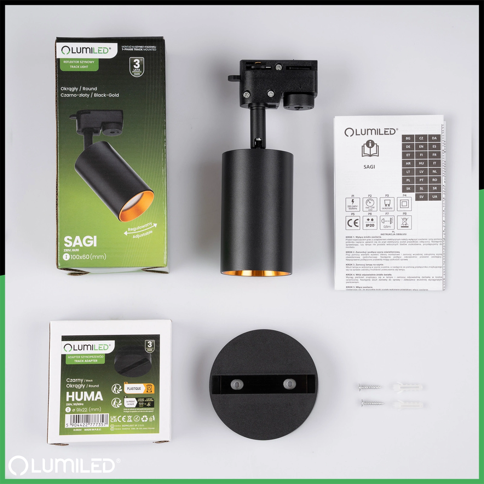 Nie musisz martwić się o dodatkowe akcesoria ani skomplikowany montaż – adapter HUMA i reflektor SAGI tworzą gotowe rozwiązanie, które błyskawicznie zainstalujesz w systemie jednofazowym. Wystarczy wpiąć reflektor w adapter i przekręcić blokadę, aby światło znalazło się dokładnie tam, gdzie chcesz. Ceramiczna oprawka z kostką GU10 zapewnia trwałe i bezpieczne podłączenie źródła światła. To zestaw, z którym poradzisz sobie sam – szybko, łatwo i bez ingerencji w instalację.