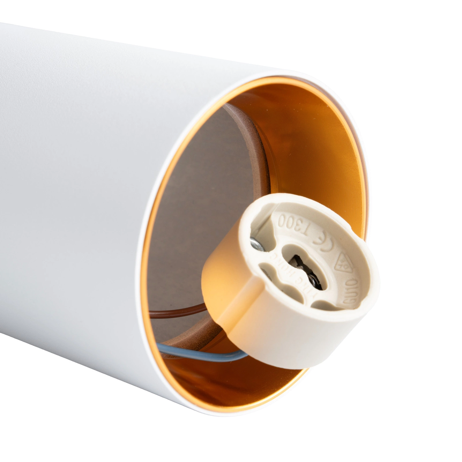 - Estetyka na najwyższym poziomie – biała oprawa ze złotym pierścieniem subtelnie podkreśla elegancję wnętrza, nie dominując przestrzeni