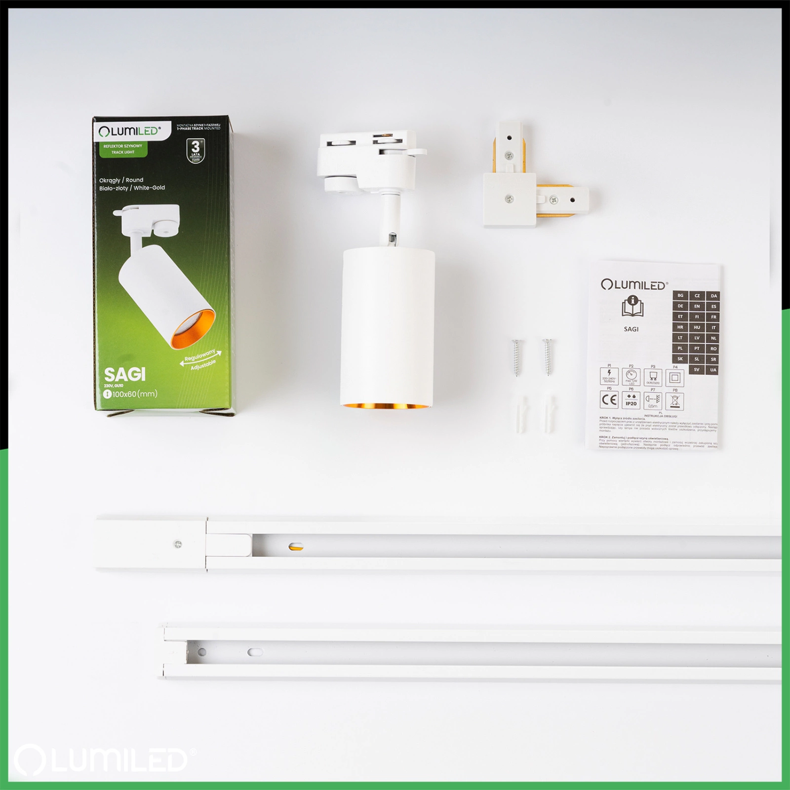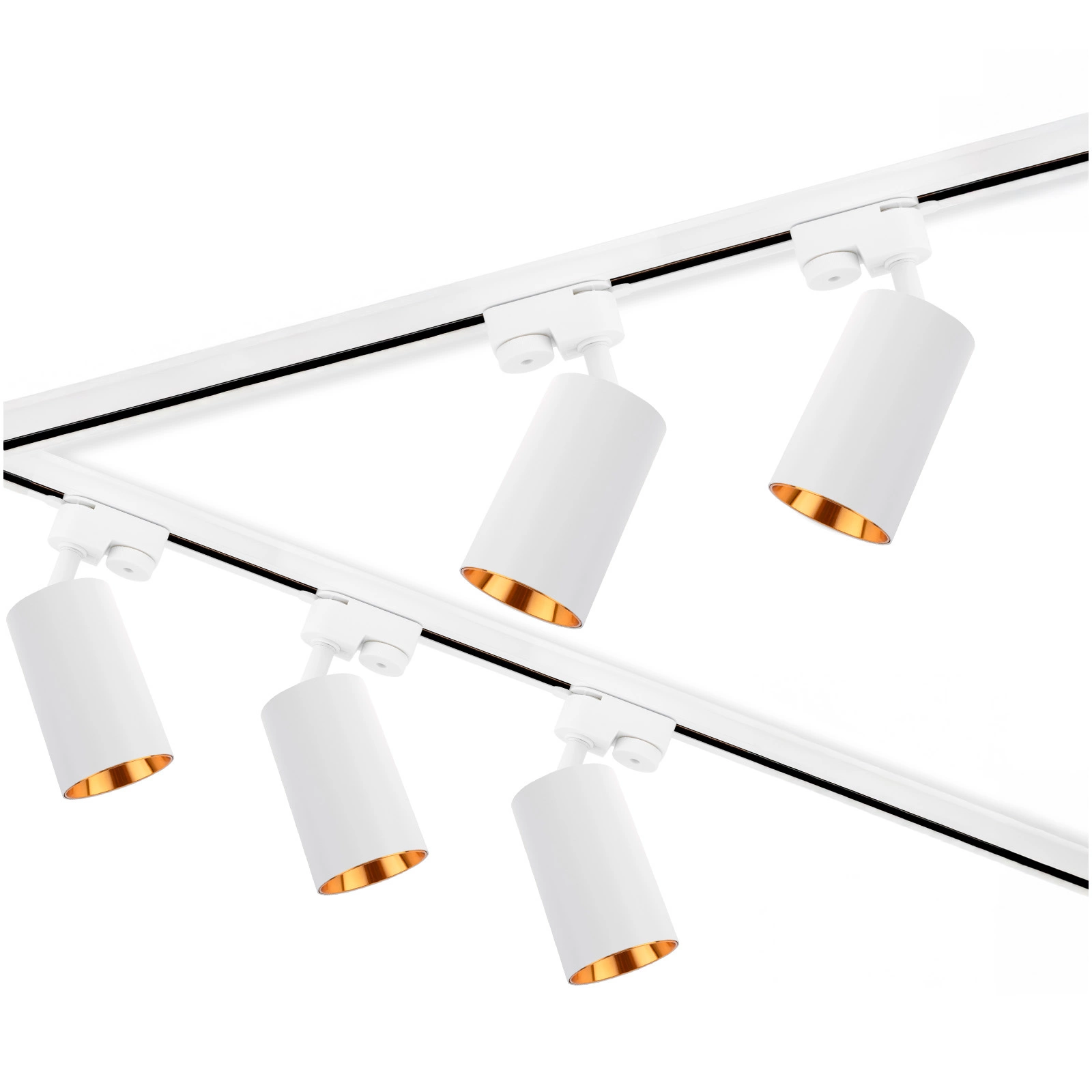 Zestaw Szyna Oświetleniowa Szynoprzewód 3m Biały + 5x Reflektor Szynowy SAGI GU10 Biało - Złoty + Łącznik L LUMILED