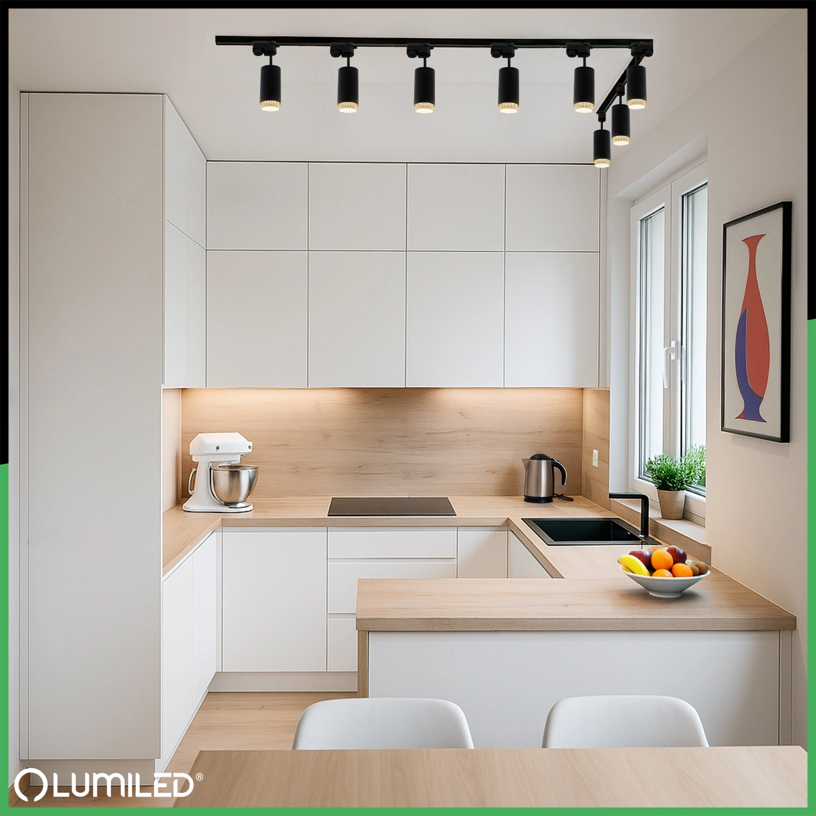 Dodaj wnętrzu ekskluzywnego blasku dzięki czarno‑złotemu oświetleniu szynowemu Lumiled. Regulowane reflektory ELIGIS z wytrzymałego aluminium zapewniają precyzyjne, kierunkowe światło, idealne do stref roboczych, blatów lub eksponowania dekoracji. Dzięki jednofazowemu szynoprzewodowi instalacja jest szybka, a możliwość przesuwania lamp daje pełną swobodę aranżacyjną – światło zawsze tam, gdzie chcesz. Gniazda GU10 obsługują żarówki LED do 12 W, więc zyskujesz jasne oświetlenie przy niskim zużyciu energii. Postaw na styl, który działa.