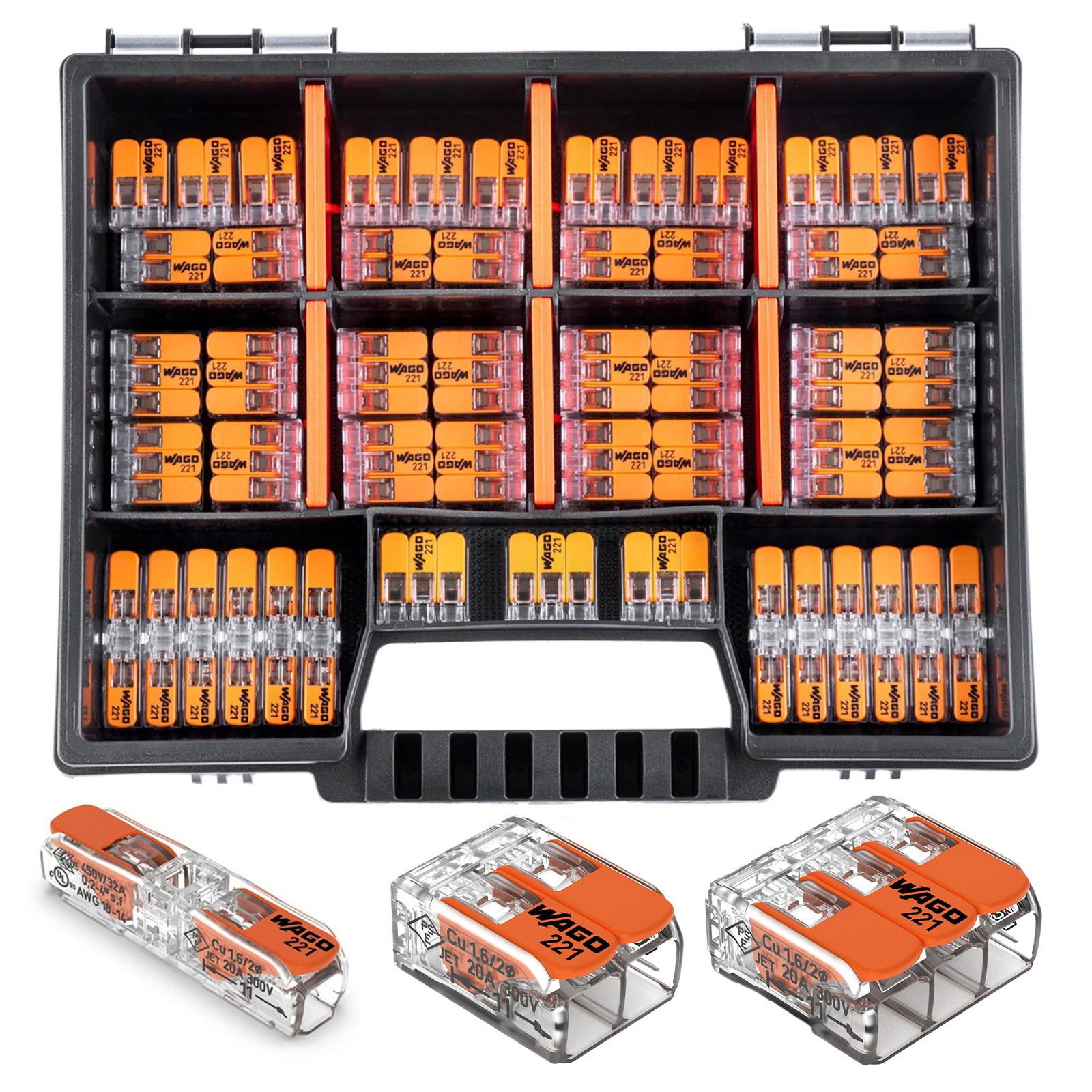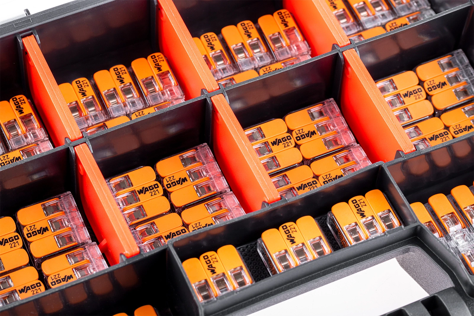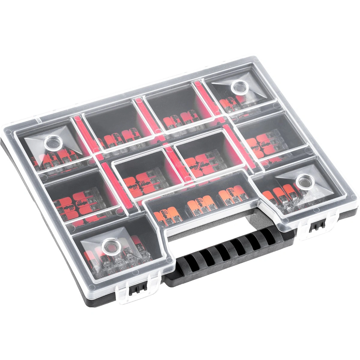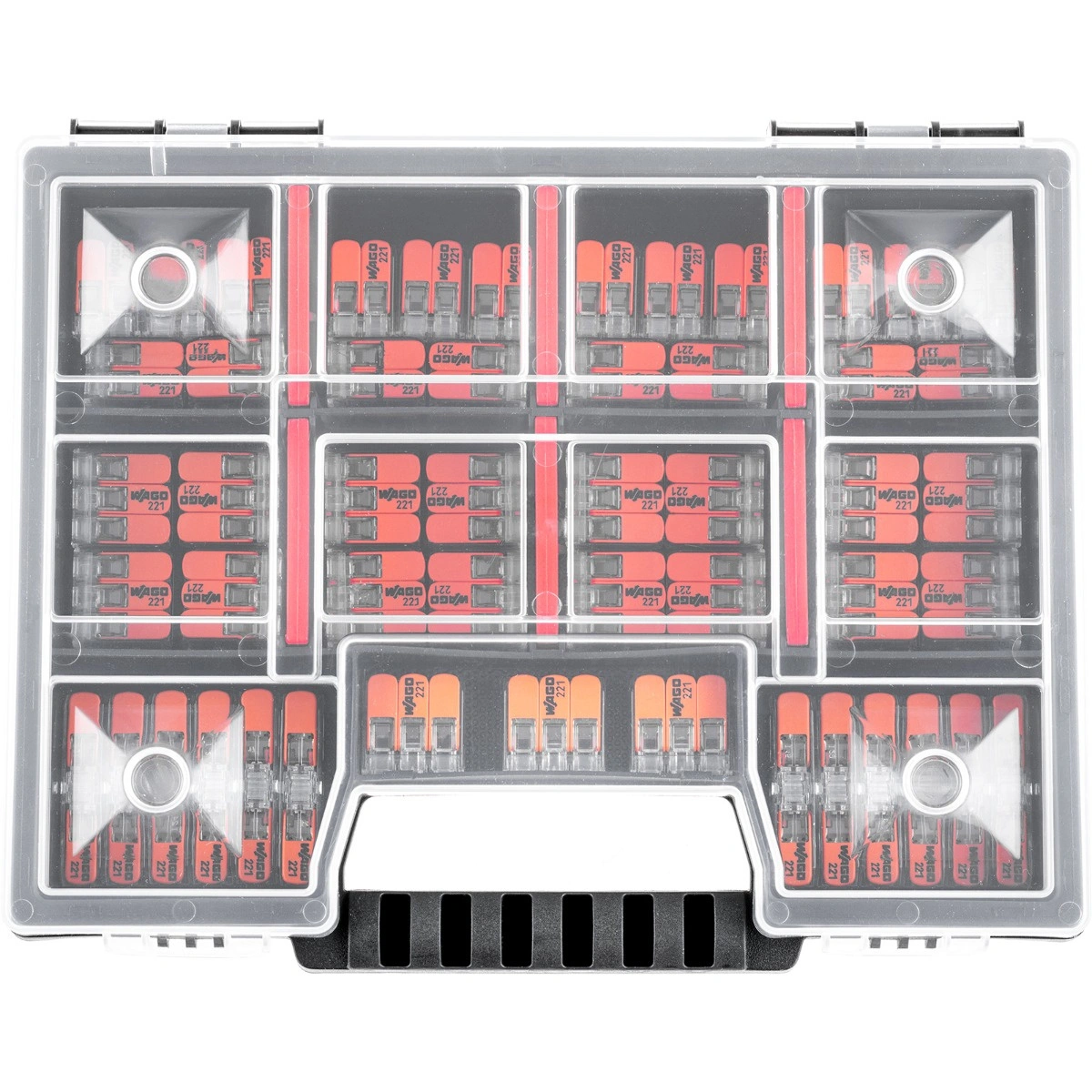 Zestaw zawiera złączki instalacyjne serii 221 renomowanej i cenionej przez instalatorów firmy WAGO, a także praktyczny organizer, który zapewnia wygodne przechowywanie i komfortowy transport całego zestawu.