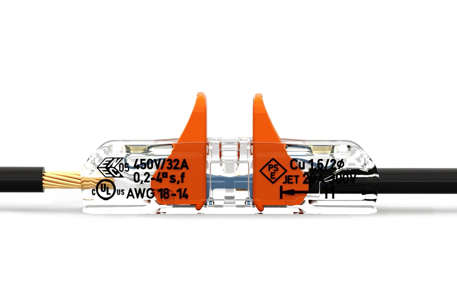 Przeźroczysta obudowa złączki pozwala na sprawdzenie poprawności wprowadzenia przewodu.